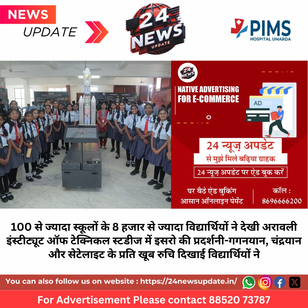 24 News Update उदयपुर। भारतीय अंतरिक्ष अनुसंधान संगठन (इसरो) द्वारा आयोजित दो दिवसीय अंतरिक्ष प्रदर्शनी के दो दिनों में उदयपुर संभाग व शहर के 100 से ज्यादा स्कूलों कें 8000 से अधिक छात्र-छात्राओं एवं आम नागरिकों को अंतरीक्ष विज्ञान और इसरो द्वारा किए जा रहे नवीन अनुसंधान के बारे में जानने को मिला। इस आयोजन में हजारों छात्रों, शिक्षकों एवं विज्ञान प्रेमियों ने भाग लिया।
