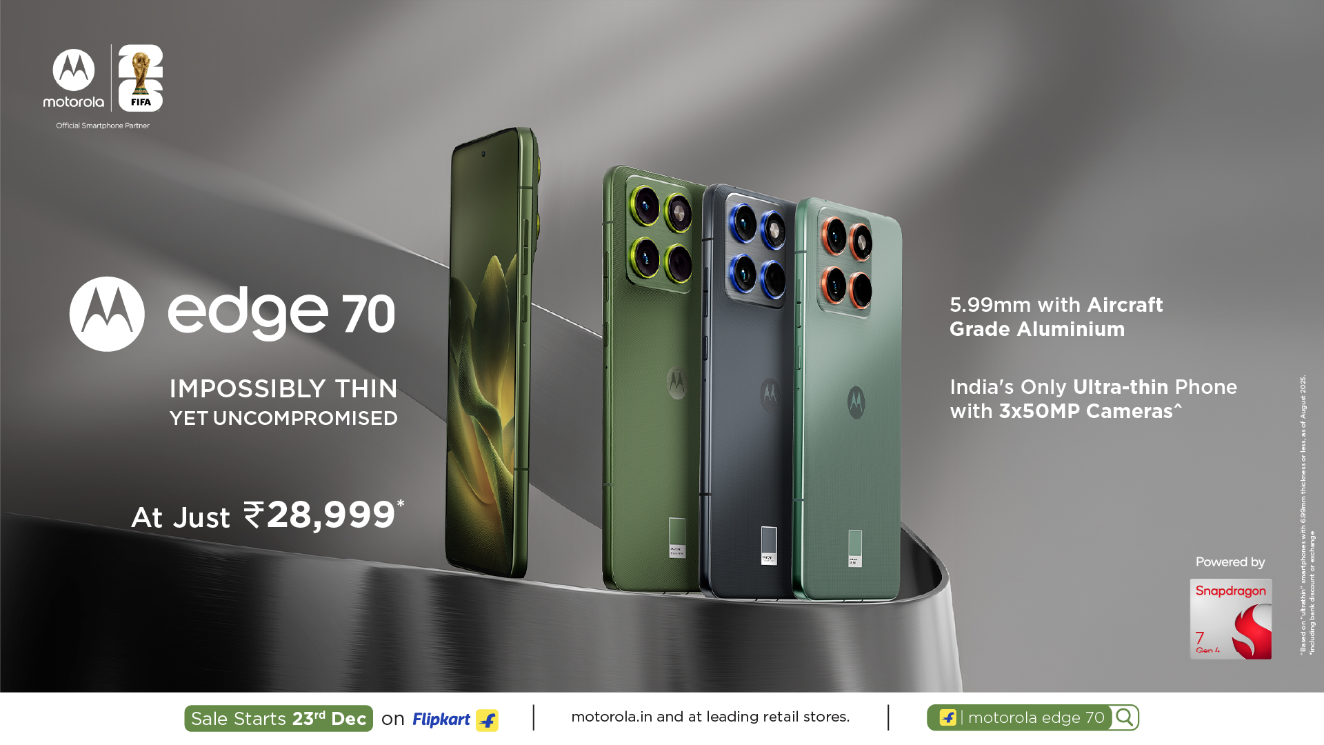 मोटोरोला इंडिया के मैनेजिंग डायरेक्टर टी.एम. नरसिम्हन ने कहा, “मोटोरोला में, हमने पारंपरिक सीमाओं को हमेशा चुनौती देना जारी रखा है और हम ग्राहकों की असली जरूरतों को अच्छी तरह समझते हुए नई-नई तकनीकें लाते हैं। मोटोरोला एज 70 के साथ, हमें गर्व है कि हम एक ऐसा फोन ला रहे हैं जो बेहद पतला डिजाइन वाला है, लेकिन कैमरा, बैटरी, स्मार्ट फीचर्स या मजबूती में कहीं कोई कमी नहीं करता। यह स्लिम स्मार्टफोन को बिल्कुल नया रूप देता है। यह लॉन्च हमारी यात्रा का एक बड़ा कदम है। हम प्रीमियम, डिजाइन पर जोर देने वाले और एआई-संचालित अनुभव देते हैं, जो यूजर्स को ज्यादा काम करने, खुद को ज्यादा व्यक्त करने और टेक्नोलॉजी से अपनी रोज की जिंदगी को बेहतर बनाने में मदद करते हैं। ये फोन बड़ी ही खूबसूरती से बनाए गए हैं और बहुत ताकतवर हैं।”