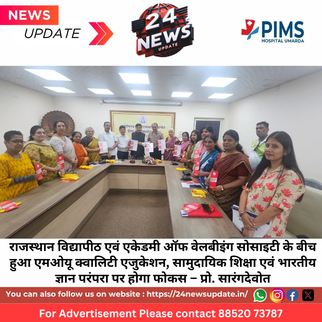 24 News update उदयपुर। जनार्दनराय नागर राजस्थान विद्यापीठ और एकेडमी ऑफ वेलबीइंग सोसाइटी के बीच शुक्रवार को प्रतापनगर स्थित कुलपति सचिवालय के सभागार में एमओयू (समझौता ज्ञापन) हुआ।
