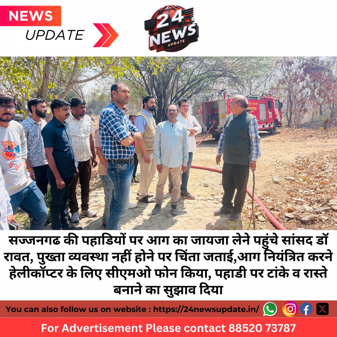 24 न्यूज़ अपडेट उदयपुर। सज्जनगढ की पहाडियों पर लगातार आग की घटनाओं पर सांसद मन्नालाल रावत ने गुरुवार को मौके का दौरा किया और अधिकारियों को निर्देश दिए कि वे इस तरह के हालात से निबटने के लिए पहले से पुख्ता व्यवस्था करें। हर साल पहाडियों पर आग की घटनाएं चिंताजनक है।