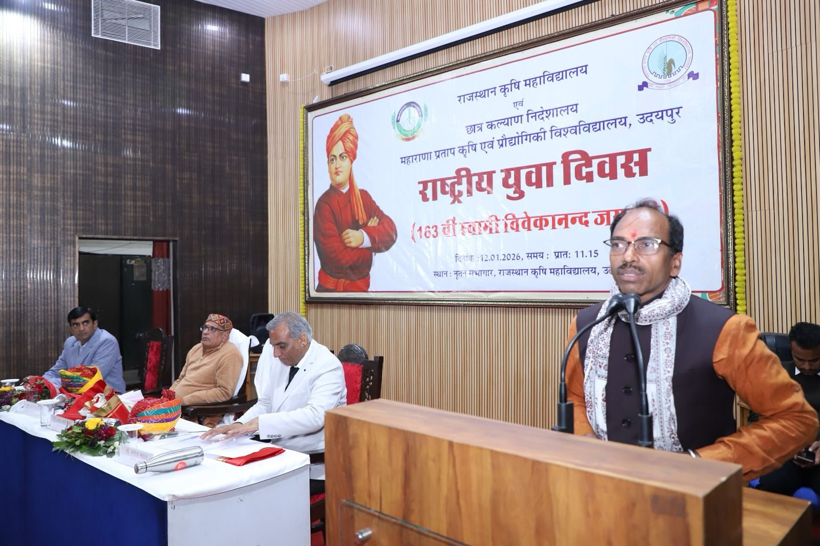 24 News Update उदयपुर। राजस्थान कृषि महाविद्यालय, उदयपुर में राष्ट्रीय युवा दिवस के अवसर पर विद्यार्थियों के व्यक्तित्व निर्माण, राष्ट्रबोध और सामाजिक उत्तरदायित्व को केंद्र में रखते हुए विविध कार्यक्रमों का आयोजन किया गया। कार्यक्रम में युवाओं से स्वामी विवेकानंद के विचारों को आत्मसात कर राष्ट्र निर्माण में सक्रिय भूमिका निभाने का आह्वान किया गया। मुख्य अतिथि उदयपुर सांसद डॉ. मन्ना लाल रावत ने विद्यार्थियों को संबोधित करते हुए कहा कि “मैं ही भारत हूं—यह भाव प्रत्येक युवा के हृदय में निरंतर धड़कना चाहिए।” उन्होंने स्वामी विवेकानंद के अमर संदेश “उठो, जागो और लक्ष्य प्राप्ति तक रुको मत” को जीवन का मूलमंत्र बनाने पर बल दिया।