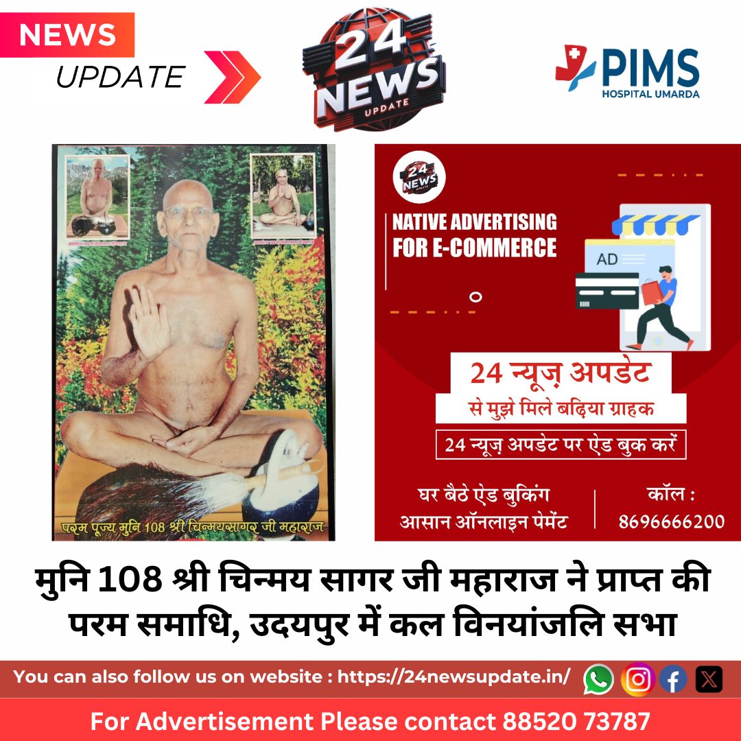 24 News Update उदयपुर। पंचम पट्टाधीश वात्सल्य वारीधी आचार्य श्री 108 वर्धमान सागर जी महाराज के परम प्रभावक शिष्य मुनि 108 श्री चिन्मय सागर जी महाराज ने 16 सितंबर 2025 को यमसलेखना पूर्ण समाधि प्राप्त की। उन्होंने अपने आचार्य श्री के मुखारविंद से णमोकार मंत्र का मंत्रोच्चार करते हुए चारों प्रकार के आहार का त्याग और तीन उपवास पूर्ण किए।