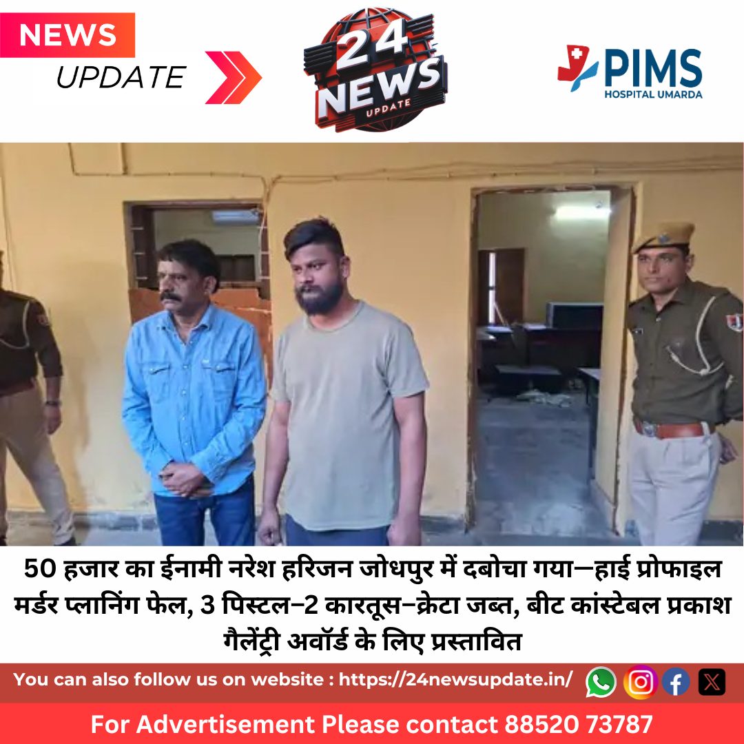 24 न्यूज अपडेट, जोधपुर। जोधपुर शहर में शुक्रवार को पुलिस ने संगठित अपराध के खिलाफ बड़ी चोट मारते हुए उदयपुर के कुख्यात हिस्ट्रीशीटर नरेश हरिजन को उसके साथी अमन वाल्मीकि के साथ दबोच लिया। दोनों एक हाई-प्रोफाइल मर्डर की प्लानिंग में जुटे थे लेकिन उससे पहले ही पुलिस की तेज कार्रवाई ने पूरा खेल बिगाड़ दिया। इस बदमाश पर हाल ही में उदयपुर आईजी ने 50 हजार के इनाम की घोषणा की थी।