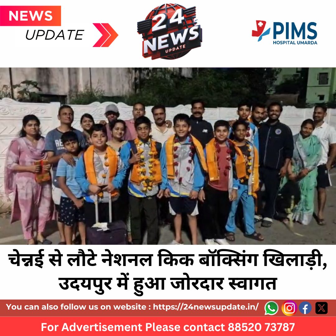 24 News Update उदयपुर। चेन्नई में आयोजित नेशनल किक बॉक्सिंग प्रतियोगिता में भाग लेकर राजस्थान टीम के खिलाड़ी उदयपुर लौटे, जहां उनका गर्मजोशी से स्वागत किया गया। उदयपुर से आठ खिलाड़ी अलग-अलग वेट और एज कैटेगरी में राजस्थान की ओर से नेशनल प्रतियोगिता में उतरे थे। टीम के दो खिलाड़ियों ने मेडल जीतकर राजस्थान का नाम रोशन किया। इसमें उदयपुर के न्यू महालक्ष्मी नगर कॉलोनी, बड़गांव निवासी रेयांश उपाध्याय ने 37 किलो वेट कैटेगरी में सिल्वर मेडल जीता, वहीं मानस भील ने 42 किलो वेट केटेगरी ने ब्रॉन्ज मेडल हासिल किया। खिलाड़ियों की इस उपलब्धि से राजस्थान टीम और परिजनों में खासा उत्साह देखा गया।