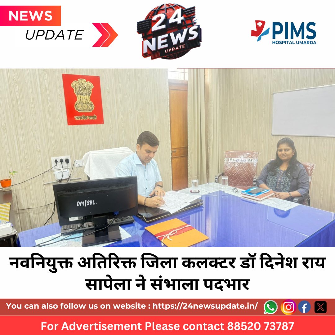 24 News Update सलूंबर। नवनियुक्त अतिरिक्त जिला कलक्टर डॉ दिनेश राय सापेला ने गुरुवार को अतिरिक्त जिला कलक्टर सलूंबर का पदभार ग्रहण किया। इस अवसर पर अतिरिक्त जिला कलक्टर राजलक्ष्मी गहलोत सहित अधिकारी उपस्थित रहे।