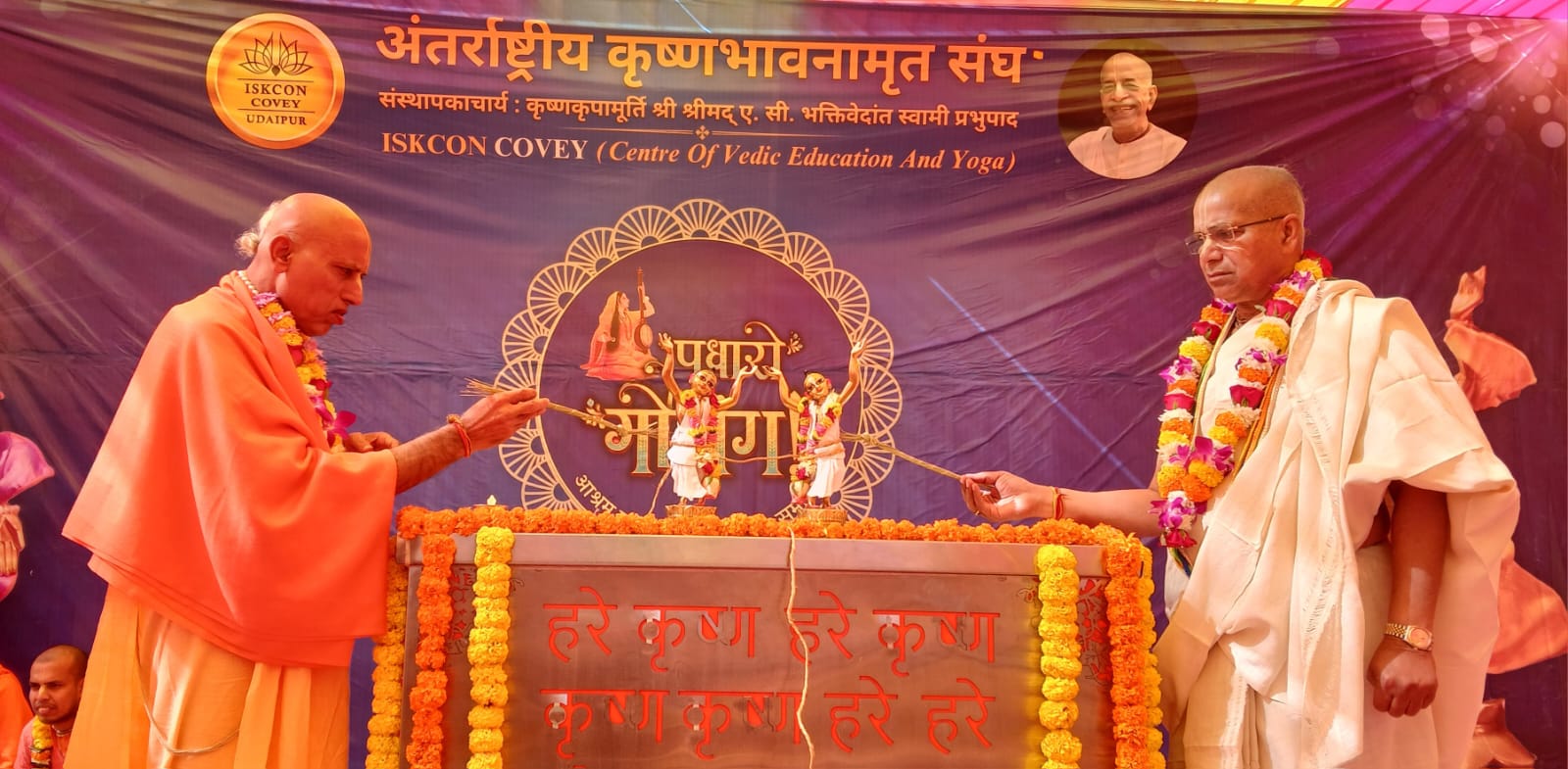 उदयपुर। चीरवा मोहनपुरा स्थित निर्माणाधीन श्री गंधर्विका गोवर्धनधारी इस्कॉन कोवे मंदिर में दो दिवसीय महोत्सव के दौरान रविवार प्रातः निताई–गौरांग प्रभु के भव्य विग्रह की प्राण प्रतिष्ठा विधिवत सम्पन्न हुई। शंख, मंजीरों, मृदंग और खरताल की मधुर ध्वनि के बीच “हरे कृष्ण-हरे राम” और “पधारो गौरांग” के उद्घोष से वातावरण भक्तिमय हो उठा। देशभर से आए वैष्णव भक्तों ने इस ऐतिहासिक आयोजन में उत्साहपूर्वक भाग लिया।