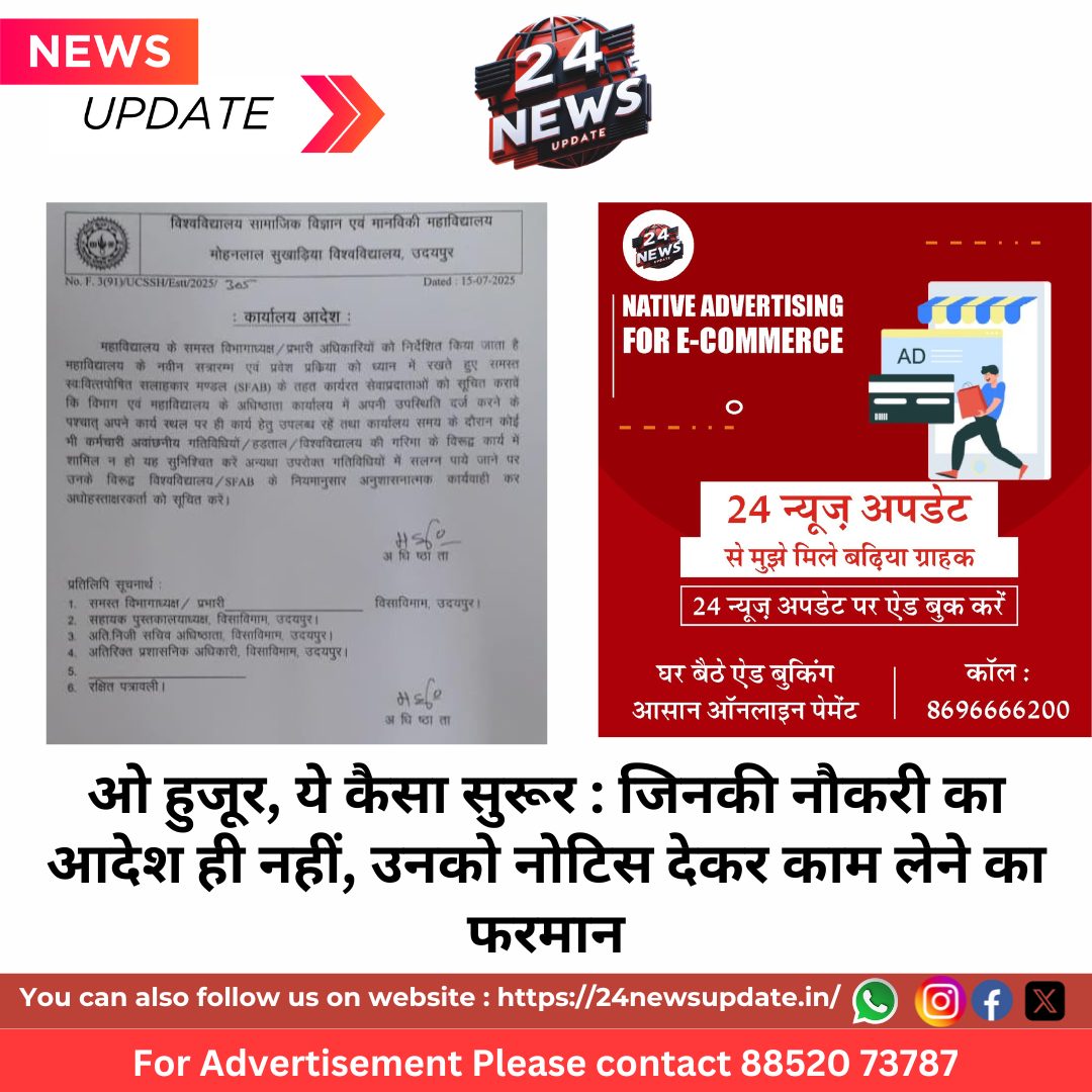 24 न्यूज अपडेट, उदयपुर। मोहनलाल सुखाड़िया विश्वविद्यालय (एमएलएसयू) प्रशासन अपने ही बनाए नियमों के जाल में उलझता नजर आ रहा है। विश्वविद्यालय प्रशासन ने स्ववित्त पोषित सलाहकार मण्डल के कर्मचारियों के कार्यादेश और वेतनादेश 1 जुलाई 2025 से जारी ही नहीं किए हैं। लेकिन अब उन्हीं कर्मचारियों को काम पर उपस्थित रहने व धरने में शामिल न होने का नोटिस थमा दिया है।