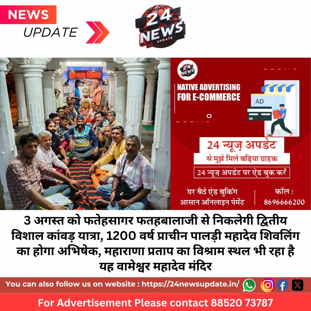 24 News Update उदयपुर। श्रावण मास की श्रद्धा और शिवभक्ति से ओतप्रोत माहौल में इस बार उदयपुरवासियों को एक विशेष आध्यात्मिक अनुभव मिलेगा। 3 अगस्त 2025, रविवार को फतेहसागर स्थित फतहबालाजी मंदिर से भव्य द्वितीय विशाल कांवड़ यात्रा का आयोजन किया जाएगा, जिसमें श्रद्धालु 1200 वर्ष पुराने पालड़ी महादेव (वामेश्वर महादेव) शिवलिंग का जलाभिषेक करेंगे।