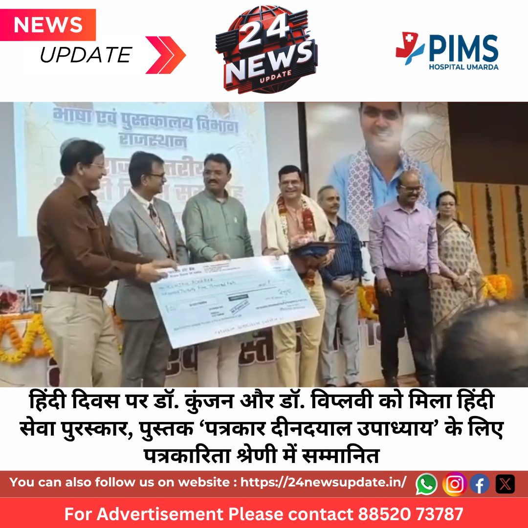 24 News Update जयपुर। मोहनलाल सुखाड़िया विश्वविद्यालय, उदयपुर के पत्रकारिता विभागाध्यक्ष डॉ. कुंजन आचार्य और स्वतंत्र पत्रकार डॉ. विजय विप्लवी को राजस्थान सरकार के भाषा एवं पुस्तकालय विभाग की ओर से रविवार को हिंदी दिवस पर आयोजित राज्य स्तरीय समारोह में हिंदी सेवा पुरस्कार प्रदान किया गया। यह सम्मान उन्हें उनकी संयुक्त रूप से लिखी गई पुस्तक ‘पत्रकार दीनदयाल उपाध्याय’ के लिए दिया गया।