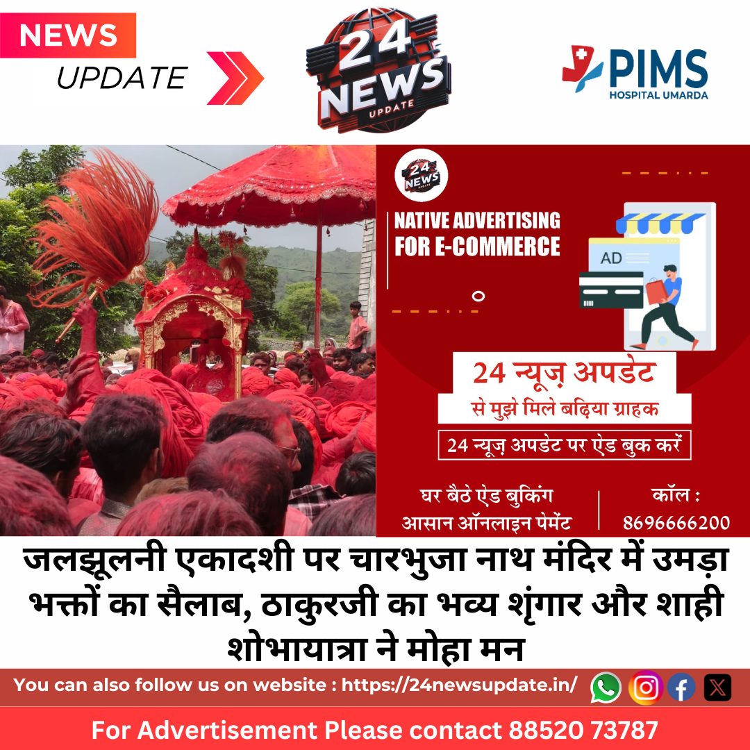 24 news update राजसमंद। मेवाड़ के प्रसिद्ध चारभुजा नाथ मंदिर में बुधवार को जलझूलनी एकादशी का भव्य मेला धार्मिक आस्था और उत्साह का केंद्र बना रहा। चारभुजा गांव और आसपास का पूरा क्षेत्र श्रद्धालुओं से खचाखच भरा रहा। मध्यप्रदेश, गुजरात, महाराष्ट्र समेत देश के विभिन्न हिस्सों से हजारों श्रद्धालु पैदल यात्रा कर यहां पहुंचे। सुबह से ही गांव की गलियों में हर-हर के जयकारे गूंजते रहे।