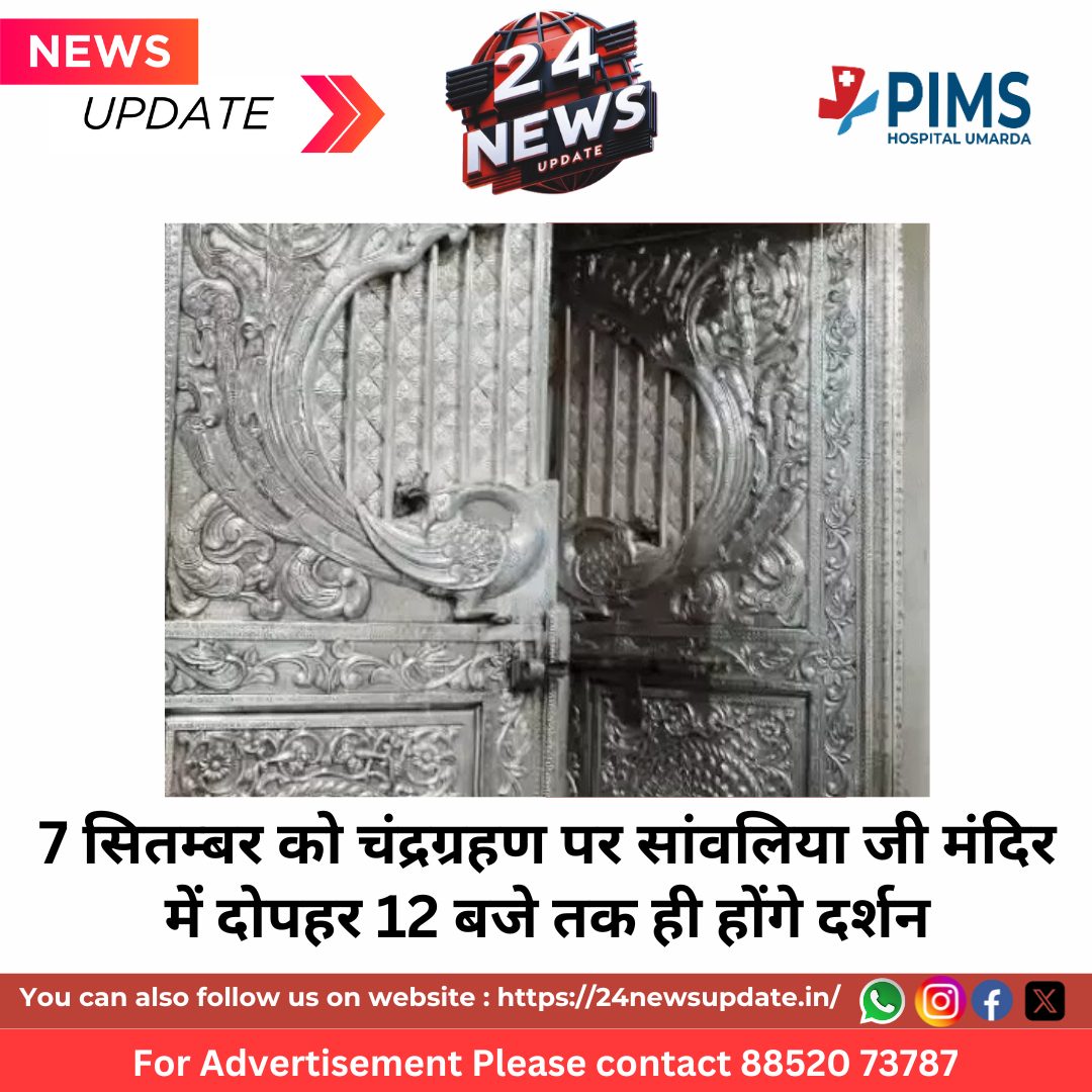 24 news Update चित्तौड़गढ़। आगामी रविवार, 7 सितम्बर को पूर्णिमा के दिन लगने वाले चंद्रग्रहण के चलते श्री सांवलिया जी मंदिर में दर्शन व्यवस्था में बदलाव किया गया है। मंदिर प्रशासन के अनुसार उस दिन श्रद्धालु केवल दोपहर 12 बजे तक ही दर्शन कर पाएंगे। इसके बाद मंदिर के कपाट बंद कर दिए जाएंगे और किसी भी भक्त को प्रवेश की अनुमति नहीं होगी।