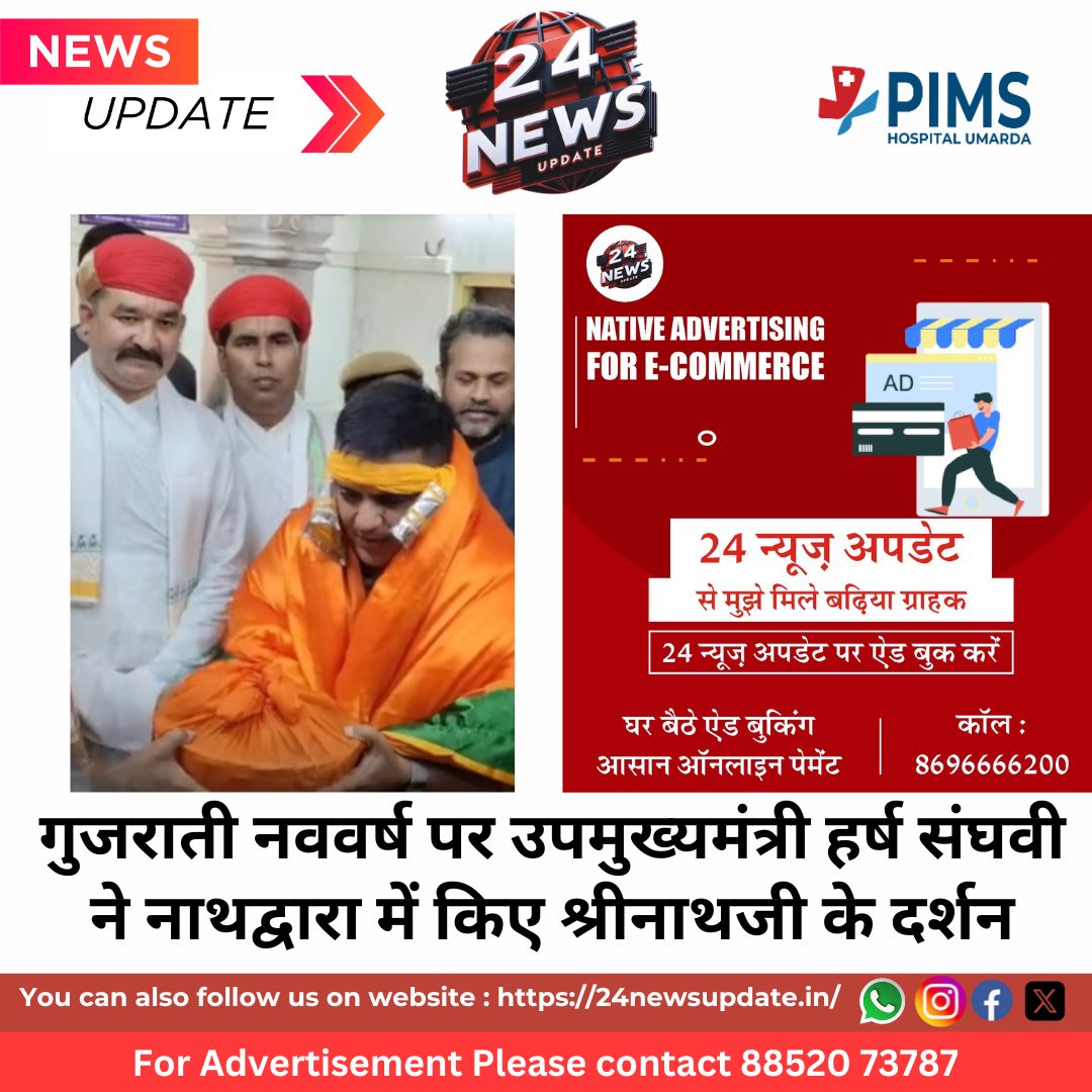 24 news Update नाथद्वारा। गुजरात के उपमुख्यमंत्री हर्ष संघवी शनिवार को गुजराती नववर्ष के शुभ अवसर पर सपरिवार नाथद्वारा पहुंचे। उन्होंने श्रीनाथजी मंदिर में ठाकुरजी की राजभोग झांकी के दर्शन किए और देश-प्रदेश की खुशहाली, समृद्धि तथा सुख-शांति की कामना की।