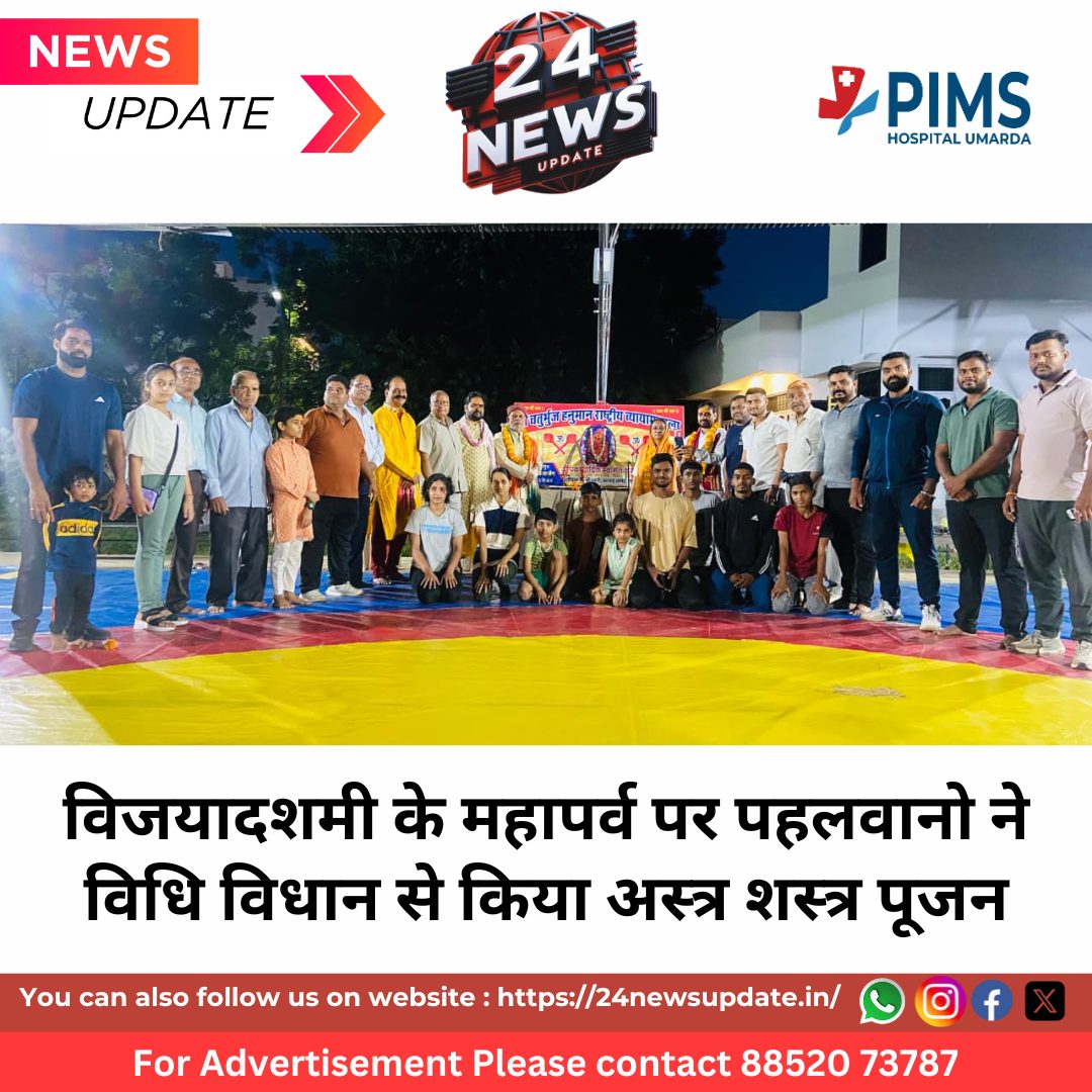 24 News Update Udaipur. विजयादशमी के शुभ अवसर पर श्री चतुर्भुज हनुमान राष्ट्रीय व्यायामशाला हरिदास जी की मगरी मे पहलवानो द्वारा विधि विधान से अस्त्र-शस्त्र का पूजन किया गया सर्व प्रथम स्वामी श्री चतुर्भुज हनुमान जी की पूजा अर्चना की गई सुंदरकांड एवं हनुमान चालीसा पाठ किया गया धूप दीप नैवेद्य एवं मौसमी फलों का भोग लगाया गया व्यायामशाला संस्थापक स्व.ओम प्रकाश सेन को पुष्पांजलि अर्पित की गई