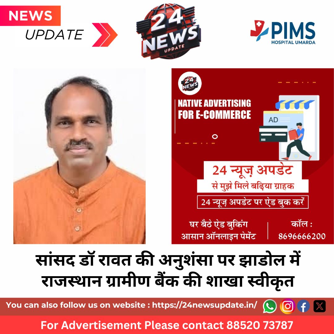 24 News Update उदयपुर। सांसद डॉ मन्नालाल रावत की अनुशंसा पर जिले की ग्राम पंचायत झाडोल, तहसील सराड़ा में राजस्थान मरुधरा ग्रामीण बैंक (अब राजस्थान ग्रामीण बैंक) की शाखा स्वीकृत कर दी गई और जल्द ही यह शाखा प्रारंभ हो जाएगी।