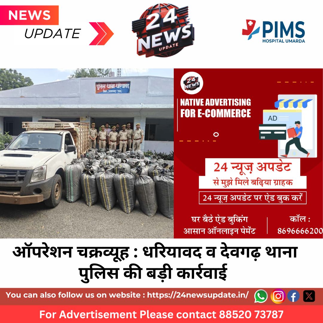 24 News Update जयपुर 26 सितंबर। ऑपरेशन चक्रव्यूह के तहत थाना धरियावद और थाना देवगढ़ पुलिस ने संयुक्त कार्रवाई कर करीब 10 क्विंटल 73 किलो 25 ग्राम अवैध डोडाचूरा सहित परिवहन में प्रयुक्त ईसूजी लोडिंग वाहन भी जब्त किया गया। जब्त डोडाचूरा की बाजार कीमत करीब 1 करोड़ 60 लाख रुपये आंकी गई है।