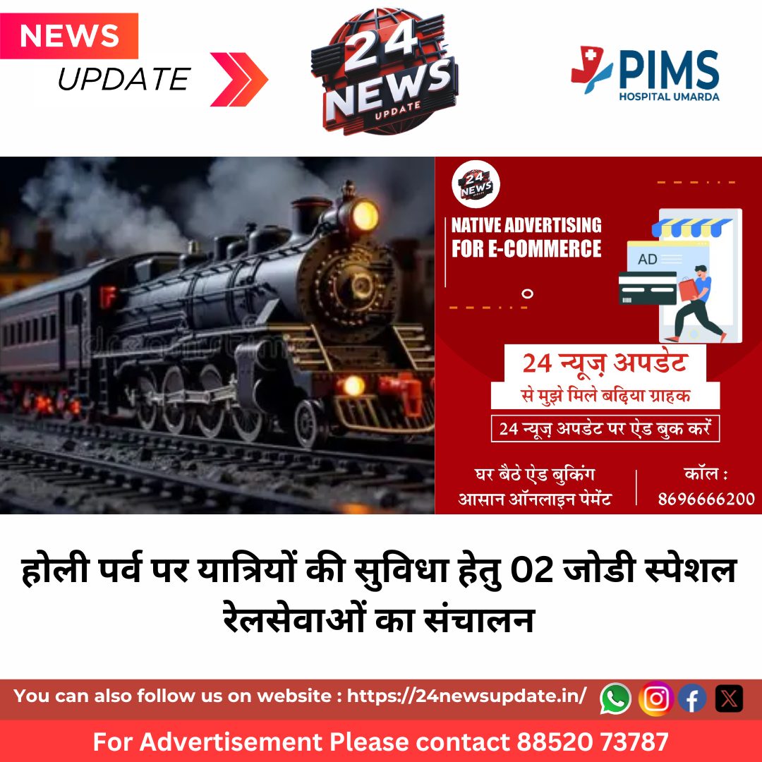 24 News Update जयपुर। रेलवे द्वारा होली के अवसर पर अतिरिक्त यात्री यातायात को देखते हुए यात्रियों की सुविधा हेतु 02 जोडी स्पेशल रेलसेवाओं का संचालन किया जा रहा है। उत्तर पश्चिम रेलवे के मुख्य जनसम्पर्क अधिकारी श्री अमित सुदर्शन के अनुसार:- गाडी संख्या 07119, चर्लपल्ली-मदार (अजमेर) साप्ताहिक स्पेशल रेलसेवा दिनांक 28.02.26, शनिवार को (01 ट्रिप) चर्लपल्ली से 23.45 बजे रवाना होकर सोमवार को 15.35 बजे मदार पहुॅचेगी। इसी प्रकार गाडी संख्य 07120, मदार (अजमेर) -चर्लपल्ली साप्ताहिक स्पेशल रेलसेवा दिनांक 03.03.26, मंगलवार को (01 ट्रिप) मदार से 08.20 बजे रवाना बुधवार को 23.20 बजे चर्लपल्ली पहुॅचेगी। यह रेलसेवा मार्ग मेे बोलारम, मेडचल, कामारेड्डी, निजामाबाद, बासर, धर्माबाद, मुदखेड, नान्देड, पूर्णा जं., बसमत, हिंगोली, वाशिम, अकोला,मल्कापुर, खंडवा (वाया भुसावल कोर्ड), इटारसी, रानी कमलापति, सीहोर, मक्सी, उज्जैन(वाया फतेहाबाद चंद्रावतीगंज), रतलाम, मंदसौर, नीमच, चित्तौडगढ, भीलवाडा, बिजयनगर, नसीराबाद व अजमेर स्टेशनों पर ठहराव करेगी। इस रेलसेवा में 01 फर्स्ट मय सैकण्ड एसी, 19 थर्ड एसी व 02 पॉवर कार डिब्बो सहि कुल 22 डिब्बे होगे। गाडी संख्या 07519, तिरूपति-मदार (अजमेर) स्पेशल रेलसेवा दिनांक 02.03.26, सोमवार को (01 ट्रिप) तिरूपति से 09.50 बजे रवाना होकर बुधवार को 15.35 बजे मदार (अजमेर) पहुॅचेगी। इसी प्रकार गाडी संख्या 07520, मदार (अजमेर)- तिरूपति स्पेशल रेलसेवा दिनांक 05.03.26, गुरूवार को (01 ट्रिप) मदार से 08.20 बजे रवाना होकर शनिवार को 11.30 बजे तिरूपति पहुॅचेगी। यह रेलसेवा मार्ग में रेणिगुंटा, गुडूर, नेल्लोर, औंगोल, बापट्ला, तेनाली, गुंटूर, सत्तेनपल्ली, नडिकुडी, मिर्योलगुढा, नल्लगोंडा, चर्लपल्ली, बोलारम, मेडचल, कामारेड्डी, निजामाबाद, बासर, धर्माबाद, मुदखेड, नान्देड, पूर्णा जं., बसमत, हिंगोली, वाशिम, अकोला, मल्कापुर, खंडवा (वाया भुसावल कोर्ड), इटारसी, रानी कमलापति, सीहोर, मक्सी, उज्जैन (वाया फतेहाबाद चंद्रावतीगंज), रतलाम, मंदसौर, नीमच, चित्तौडगढ, भीलवाडा, बिजयनगर, नसीराबाद व अजमेर स्टेशनों पर ठहराव करेगी। इस रेलसेवा में 03 सैकण्ड एसी, 07 थर्ड एसी, 06 द्वितीय शयनयान, 04 साधारण श्रेणी, 02 पॉवरकार डिब्बो सहित कुल 22 डिब्बे होगे। Share this: Share on X (Opens in new window) X Share on Facebook (Opens in new window) Facebook More Email a link to a friend (Opens in new window) Email Share on WhatsApp (Opens in new window) WhatsApp Like this:Like Loading... Related Discover more from 24 News Update Subscribe to get the latest posts sent to your email. Type your email… Subscribe Post navigation 900 करोड़ का JJM घोटाला: 9 अफसर 3 दिन की ACB रिमांड पर अंतरराज्यीय शादी रैकेट का भंडाफोड़ : बंगाल, असम, बिहार, यूपी, झारखंड से युवतियां लाकर रचते थे सौदेबाजी