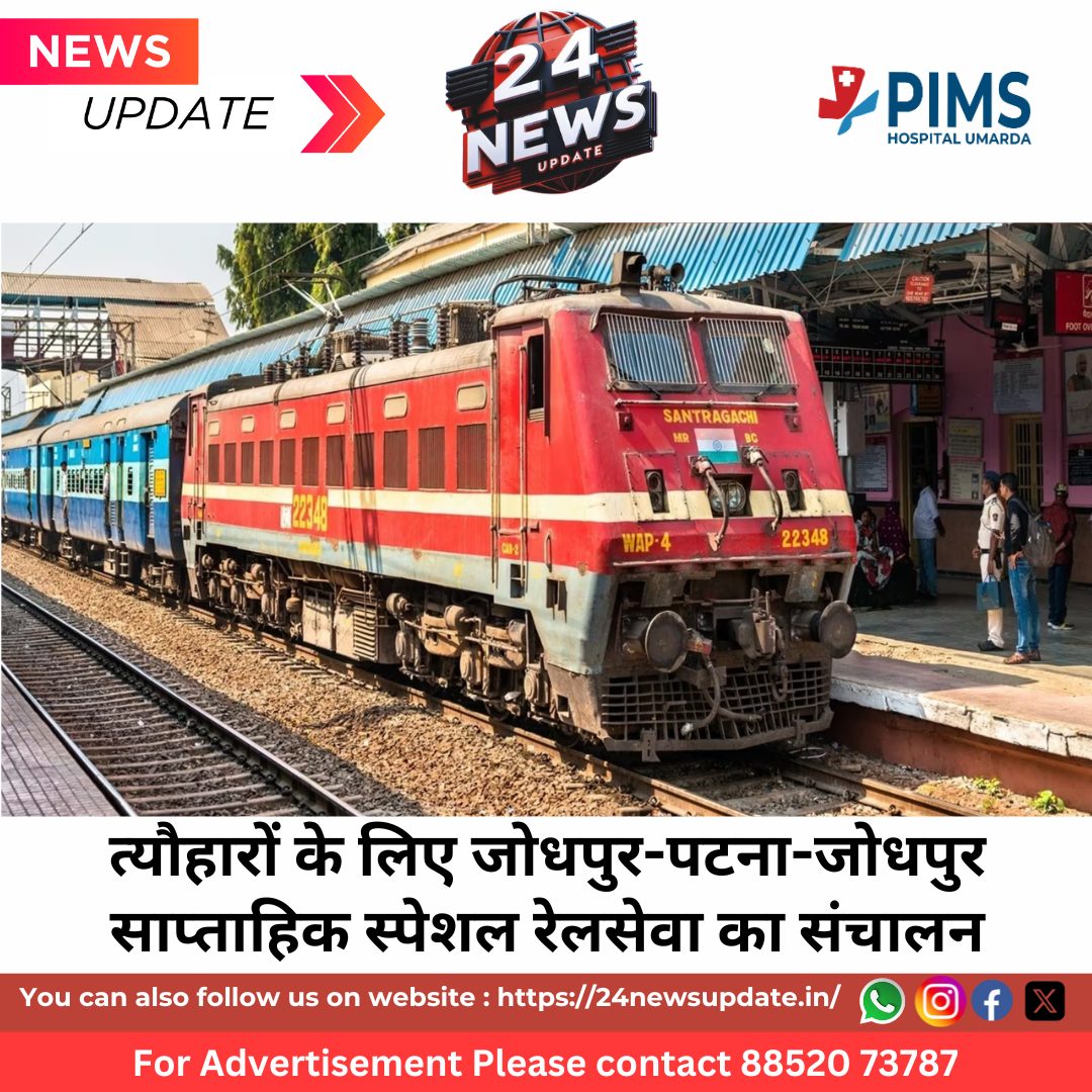 24 न्यूज अपडेट, जयपुर। रेलवे द्वारा आगामी त्यौहारों पर यात्री यातायात को देखते हुए यात्रियो की सुविधा हेतु जोधपुर-पटना-जोधपुर साप्ताहिक स्पेशल रेलसेवा का संचालन किया जा रहा है।