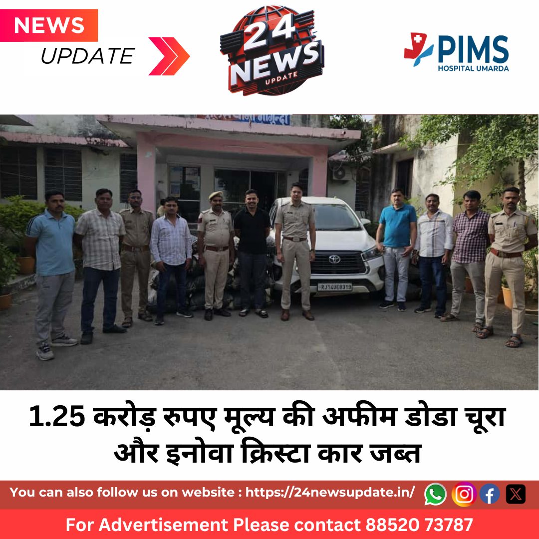 24 News Update उदयपुर, 07 अक्टूबर 2025। उदयपुर जिले के थाना गोगुन्दा क्षेत्र में पुलिस ने अवैध मादक पदार्थों के परिवहन के खिलाफ एक महीने में दूसरी बड़ी कार्रवाई करते हुए करीब 1.25 करोड़ रुपए मूल्य की अफीम डोडा चूरा जब्त की है। इस कार्रवाई में ईनोवा क्रिस्टा कार RJ-14-UE-8319 भी पुलिस के कब्जे में आई।