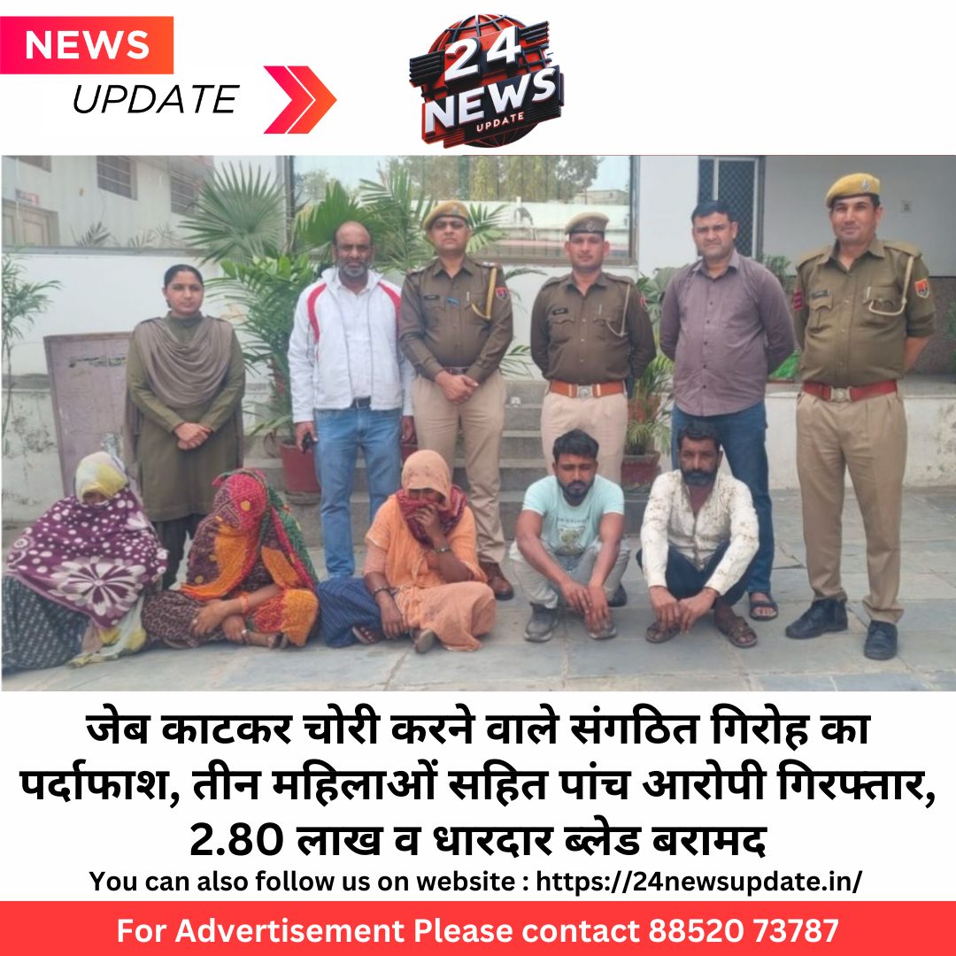 24 न्यूज अपडेट उदयपुर। जिला विशेष टीम (DST) और थाना हिरणमगरी पुलिस ने संयुक्त कार्रवाई करते हुए जेब काटकर पैसे चोरी करने वाले संगठित गिरोह का पर्दाफाश किया है। पुलिस ने गिरोह के तीन महिलाओं सहित कुल पांच आरोपियों को गिरफ्तार किया है, जिनके पास से 2.80 लाख रुपये नकद और धारदार ब्लेड बरामद किए गए।