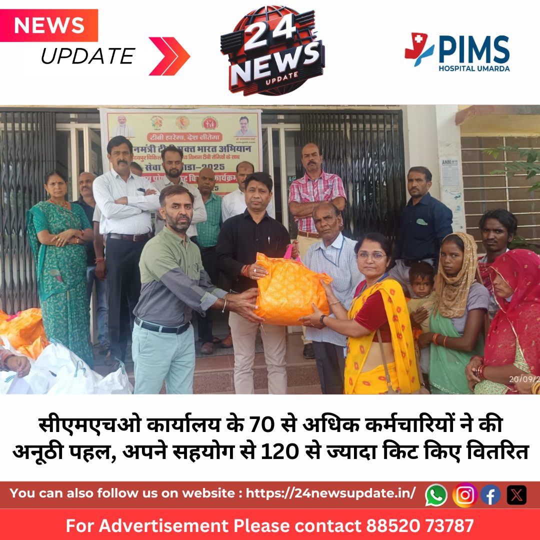 24 न्यूज अपडेट, उदयपुर। प्रधानमंत्री टीबी मुक्त भारत अभियान सेवा पखवाड़ा-2025 के अंतर्गत राष्ट्रीय क्षय उन्मूलन कार्यक्रम के तहत राज्य सरकार द्वारा दिए गए निर्देशों के अनुसार शनिवार को जिला मुख्यालय पर मुख्य चिकित्सा एवं स्वास्थ्य अधिकारी (सीएमएचओ) कार्यालय परिसर में विशेष कार्यक्रम आयोजित किया गया। इसमें सीएमएचओ कार्यालय के 70 से अधिक चिकित्सा अधिकारी एवं कर्मचारियों ने अनूठी पहल करते हुए स्वयं के सहयोग से 100 से अधिक निक्षय मित्र बने और 121 से अधिक टीबी मरीजों को पोषण किट वितरित की।
