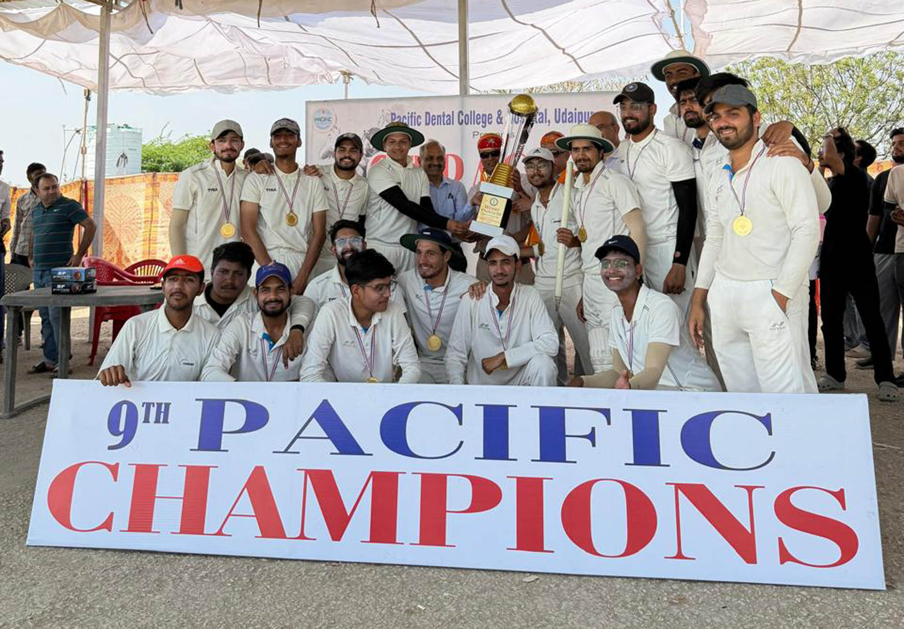 24 News Update उदयपुर। पेसिफिक कप क्रिकेट टूर्नामेंट 2026 का आयोजन 9 से 13 मार्च तक किया गया। प्रतियोगिता में चार राज्यों और एक केंद्र शासित प्रदेश की कुल 14 टीमों ने भाग लिया। पूरे टूर्नामेंट में कुल 21 मैच खेले गए। सभी मैच खेलगांव एवं करणपुर क्रिकेट मैदान पर आयोजित किए गए। टूर्नामेंट का फाइनल मुकाबला पेसिफिक डेंटल कॉलेज देबारी और जयपुर डेंटल कॉलेज के बीच खेला गया, जिसमें पैसिफिक डेंटल कॉलेज एंड हॉस्पिटल ने शानदार प्रदर्शन करते हुए टूर्नामेंट का खिताब अपने नाम किया। फाइनल मैच में डॉ. अरशद अकून ने शानदार ऑलराउंड प्रदर्शन करते हुए 21 रन बनाए और 3 विकेट लिए, जिसके लिए उन्हें मैन ऑफ द मैच घोषित किया गया।टूर्नामेंट के सर्वश्रेष्ठ बल्लेबाज हार्दिक जैन, सर्वश्रेष्ठ गेंदबाज सचिन, सर्वश्रेष्ठ फील्डर कृष्णा जाट और मैन ऑफ द सीरीज सचिन (120 रन और 17 विकेट) रहे। ये चारों खिलाड़ी जयपुर डेंटल कॉलेज से थे।समापन समारोह में मुख्य अतिथि के रूप में मनोज चौधरी, सचिव, उदयपुर जिला क्रिकेट संघ उपस्थित रहे। कार्यक्रम के विशिष्ट अतिथियों में डॉ. मनोहर भट्ट (प्राचार्य, जयपुर डेंटल कॉलेज), डॉ. ए. भगवंदास राय (प्राचार्य, पैसिफिक डेंटल कॉलेज एंड हॉस्पिटल) तथा डॉ. मोहित पाल सिंह (उप प्राचार्य, पैसिफिक डेंटल कॉलेज) शामिल रहे। इस अवसर पर डॉ. कमलेश गर्ग, डॉ. हेमंत माथुर, डॉ. असीम जैन, डॉ. आशीष बाली, डॉ. मनन भी उपस्थित रहे। कार्यक्रम का सफल संचालन डॉ. कैलाश असावा द्वारा किया गया। Share this: Share on X (Opens in new window) X Share on Facebook (Opens in new window) Facebook More Email a link to a friend (Opens in new window) Email Share on WhatsApp (Opens in new window) WhatsApp Like this:Like Loading... Related Discover more from 24 News Update Subscribe to get the latest posts sent to your email. Type your email… Subscribe Post navigation खन्ना साहब ने सड़कें करवाईं कूल—कूल, 7 कूलर, 1 एसी तथा 1 वॉशिंग जब्त एआईटीएस के मेगा जॉब फेयर में हाथों-हाथ नौकरी पाने वाले युवाओं में खुशी का नहीं रहा ठिकाना, 41 कंपनियां शामिल, जॉब फेयर का सफल आयोजन, 400 से अधिक विद्यार्थियों ने किया पंजीकरण