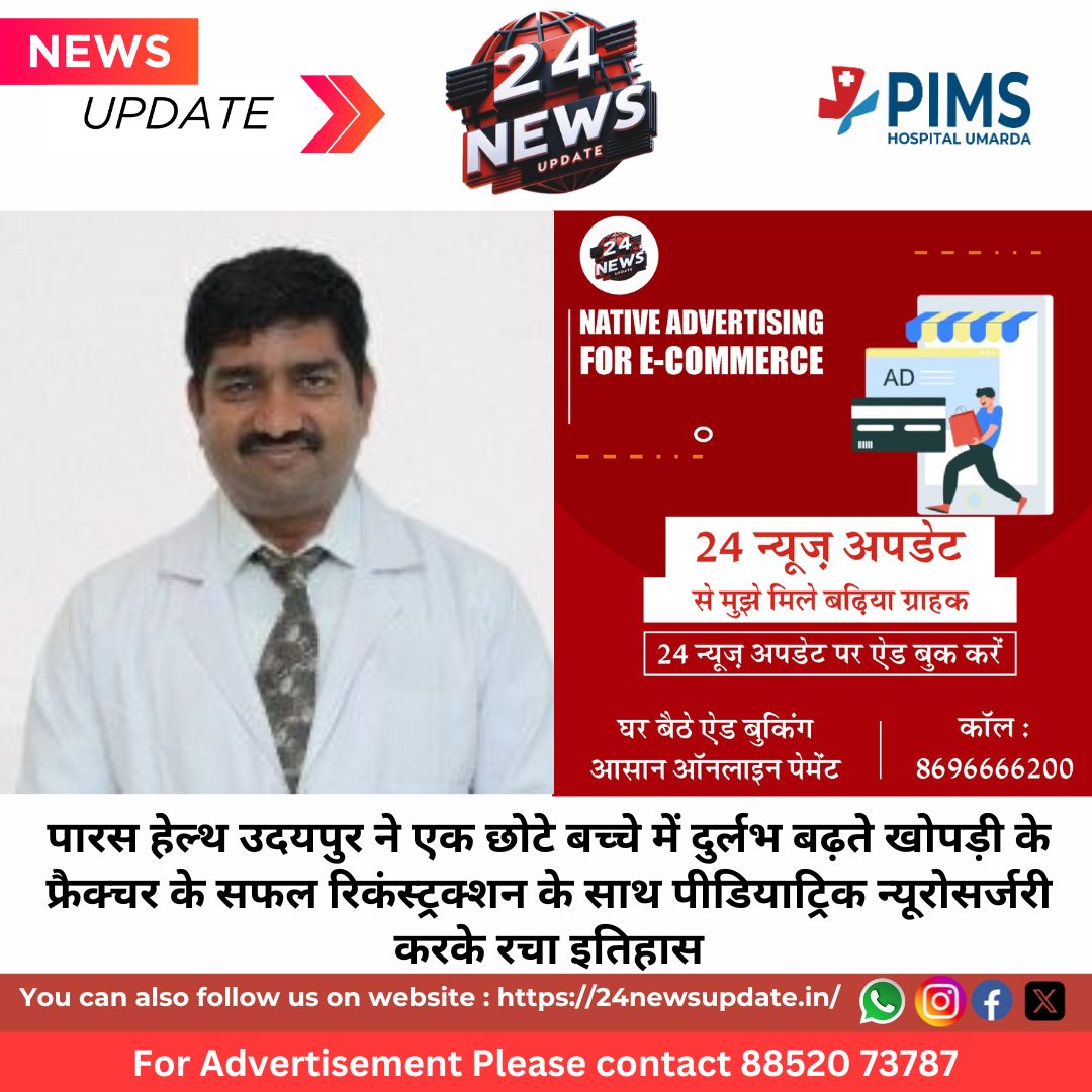 पारस हेल्थ उदयपुर ने 2 साल के बच्चे में खोपड़ी के फ्रैक्चर का किया सफल इलाज़, पीडियाट्रिक न्यूरोसर्जरी में स्थापित किया नया बेंचमार्क