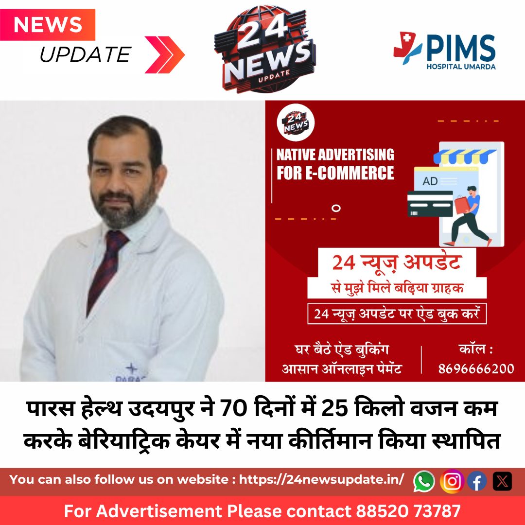 24 News Update उदयपुर : एक शानदार मेडिकल उपलब्धि हासिल करते हुए पारस हेल्थ उदयपुर ने राजस्थान के बांसवाड़ा की 33 वर्षीय महिला में सफल स्लीव गैस्ट्रेक्टोमी (एसजी) के बाद 70 दिनों के भीतर 25 किलोग्राम वजन कम किया। एडवांस्ड लैप्रोस्कोपिक और बैरिएट्रिक सर्जरी के कंसल्टेंट डॉ. अभिषेक व्यास के नेतृत्व में यह प्रक्रिया हुई। यह सफलता दर्शाती है कि कैसे समय पर मेडिकल हस्तक्षेप मोटापे और इससे जुड़ी जटिलताओं का असरदार तरीके से इलाज कर सकता है।