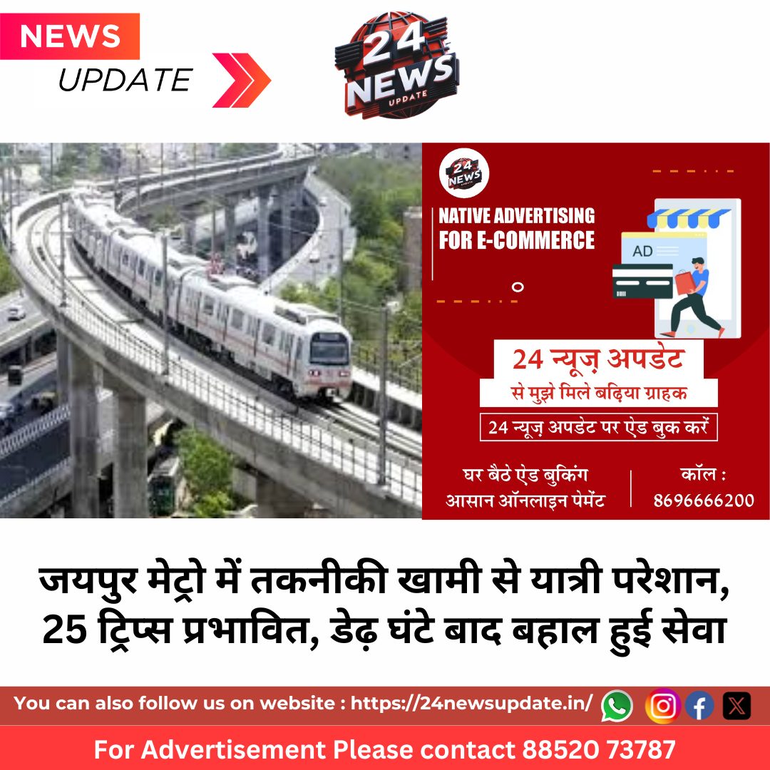 24 News Update. जयपुर। सोमवार सुबह जयपुर मेट्रो में तकनीकी खराबी के चलते यात्रियों को भारी परेशानी का सामना करना पड़ा। मानसरोवर से बड़ी चौपड़ के बीच संचालित मेट्रो ट्रेन अचानक कई बार बीच रास्ते में रुक गई, जिससे सफर कर रहे यात्री घंटों तक फंसे रहे। शुरुआती तकनीकी खामी के बाद मेट्रो का संचालन करीब डेढ़ घंटे बाधित रहा, जिसे तकनीकी टीम ने सुधारकर सुचारु किया।
