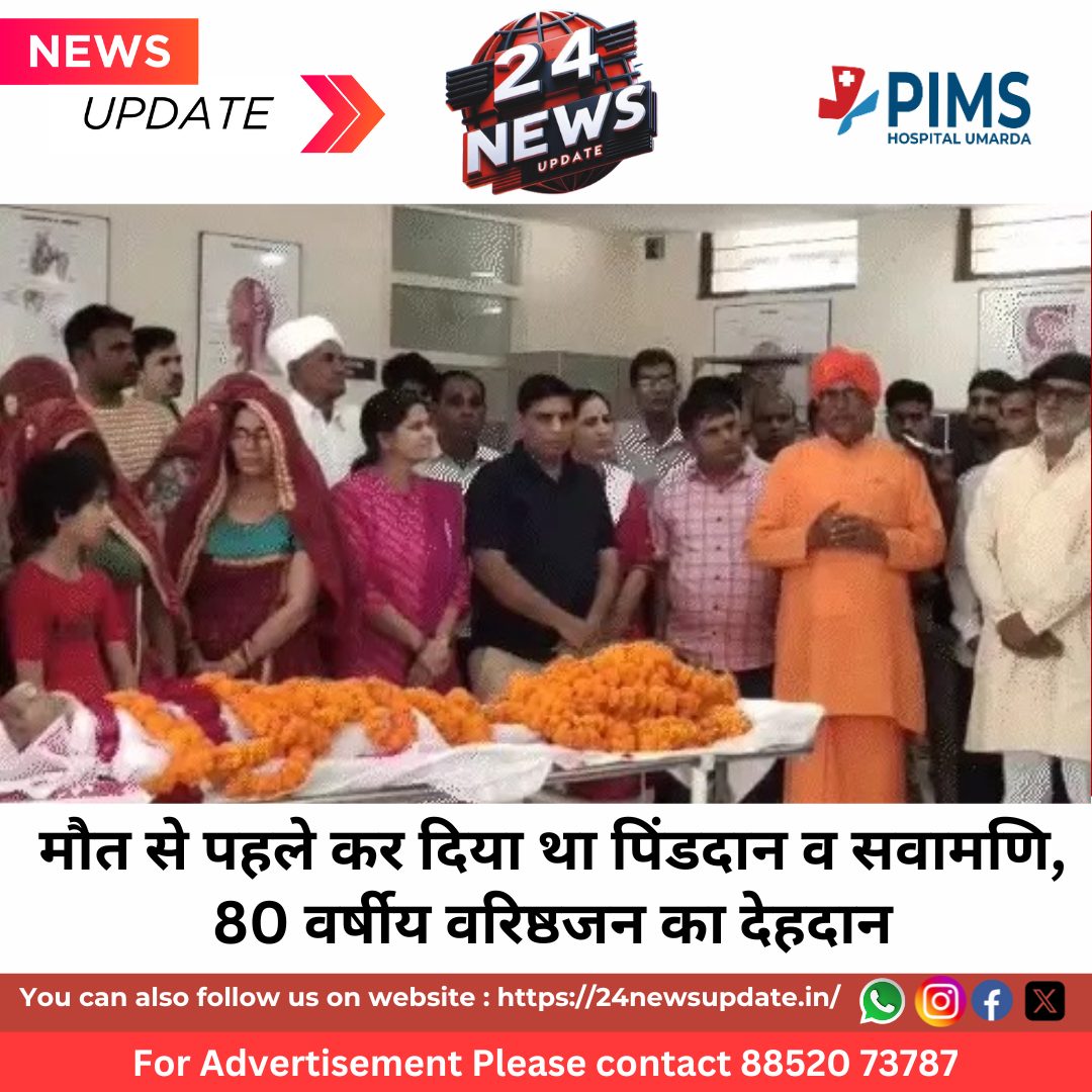 24 न्यूज अपडेट, सीकर। शहर के तारपुरा के रामा टांडा निवासी चौधरी तुलसीराम भगत (80) ने गुरुवार-शुक्रवार की दरम्यानी रात अपने जीवन का अंतिम योगदान देते हुए एसके मेडिकल कॉलेज में बॉडी डोनेट की। उनके इस कदम से मेडिकल छात्रों को मानव शरीर की गहन अध्ययन सुविधा प्राप्त होगी और समाज में बॉडी डोनेशन की जागरूकता को बल मिलेगा।देहदान की पहले से की थी घोषणातुलसीराम भगत ने तीन साल पहले ही अपने अंतिम संस्कार और पिंडदान का निर्णय ले लिया था। 4 जुलाई 2022 को उन्होंने अपनी पत्नी भगवानी देवी के साथ हरिद्वार जाकर गंगा में पिंडदान और सवामणी किया और अपने परिवार को बॉडी डोनेशन की घोषणा पूरी करने का निर्देश दिया।एसके मेडिकल कॉलेज में बॉडी डोनेटबीएल मील, बॉडी डोनेशन मोटिवेटर, ने बताया कि मृत्युपरांत परिवार और मेडिकल कॉलेज के स्टाफ ने तुलसीराम भगत के चित्र पर माल्यार्पण व पुष्प अर्पित कर श्रद्धांजलि दी। उनका कहना है कि 80 वर्ष की आयु में भी तुलसीराम भगत किसी शारीरिक रोग से पीड़ित नहीं थे। तुलसीराम भगत के इस पुण्य कार्य में उनके परिवार का पूर्ण समर्थन रहा। उनकी पत्नी भगवानी देवी ने भी पहले ही बॉडी डोनेशन की घोषणा कर रखी थी। उनके चार बेटे और एक बेटी शारदा रैवासा, महेंद्र, राजेंद्र, मनोज और सुभाष कृ इस फैसले के साथ खड़े रहे। Share this: Share on X (Opens in new window) X Share on Facebook (Opens in new window) Facebook More Email a link to a friend (Opens in new window) Email Share on WhatsApp (Opens in new window) WhatsApp Like this:Like Loading... Related Discover more from 24 News Update Subscribe to get the latest posts sent to your email. Type your email… Subscribe Post navigation संगठन सृजन अभियान के तहत प्रतापगढ़ कांग्रेस अल्पसंख्यक संगठन की विशेष बैठक सम्पन्न, सर्वसम्मति से रफीक शेख बसाड़ का नाम जिला अध्यक्ष पद हेतु प्रस्तावित ब्लाइंड मर्डर का खुलासा: गहने हड़पने के लिए की गई महिला की हत्या