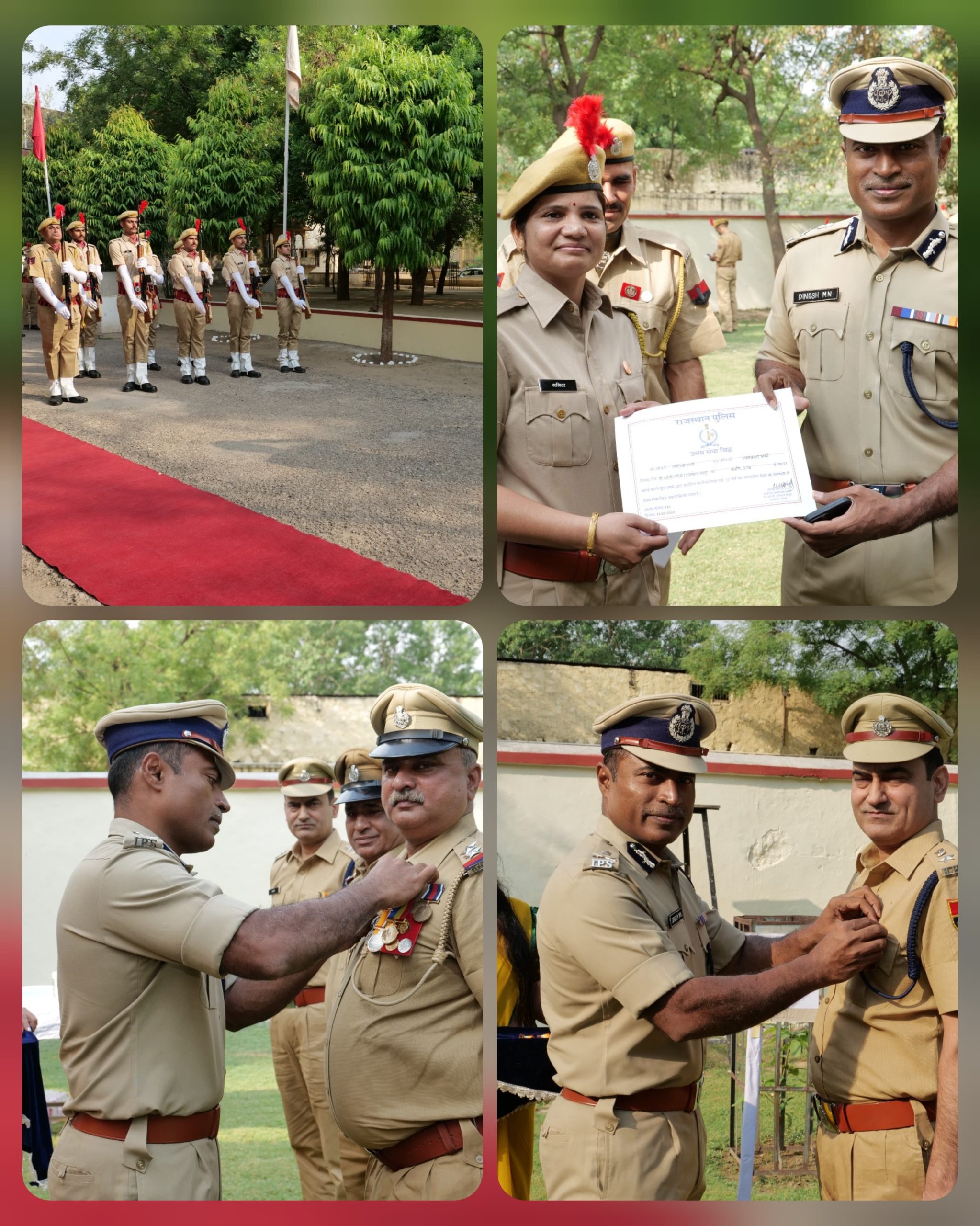 उत्कृष्ट सेवा पदक से पुलिस निरीक्षक सुरेंद्र कुमार, हेड कांस्टेबल सुमेर सिंह, महेश कुमार, कांस्टेबल ललित कुमार, मनोहर लाल, कांस्टेबल चालक रमेश दत्त यादव, मथुरेश कुमार कसाना, जगदीश प्रसाद व गौरी शंकर त्रिपाठी को सम्मानित किया गया।