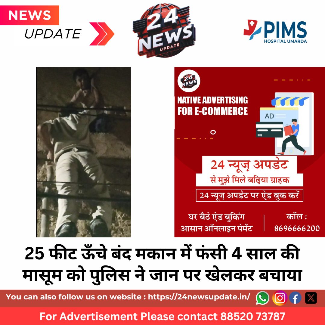 24 News Update जयपुर। राजस्थान पुलिस ने सोमवार रात एक बार फिर सेवा, संवेदना और समर्पण की मिसाल कायम की। अलवर शहर में 25 फीट ऊँचे बंद मकान की पहली मंजिल पर फंसी 4 वर्षीय मासूम निधि राठौड़ को पुलिस टीम ने जोखिम भरे ऑपरेशन में सुरक्षित बचा लिया। डीजीपी राजीव कुमार शर्मा ने इस त्वरित कार्रवाई की सराहना करते हुए कहा कि यह “राजस्थान पुलिस की सेवा और संवेदना का जीवंत उदाहरण” है।