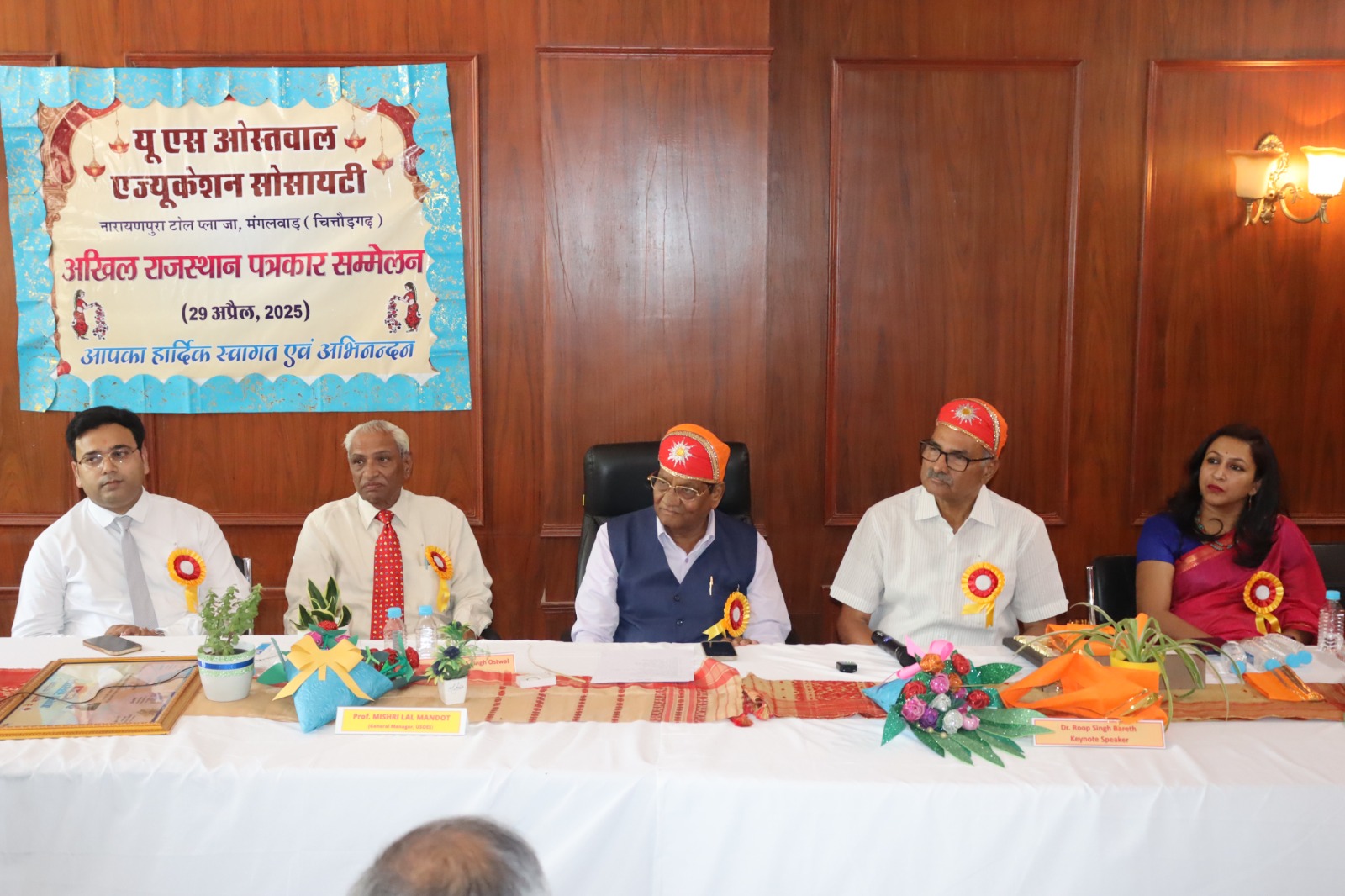 24 न्यूज अपडेट, उदयपुर। यू.एस. ओस्तवाल एजुकेशन सोसायटी परिसर, मंगलवाड़ में अखिल राजस्थान पत्रकार सम्मेलन-2025 का सफल आयोजन किया गया। कार्यक्रम में ओस्तवाल ग्रुप के चेयरमैन श्री उमराव सिंह ओस्तवाल मुख्य अतिथि रहे, जबकि महर्षि दयानंद सरस्वती विश्वविद्यालय, अजमेर के पूर्व कुलपति प्रो. रूप सिंह बारेठ ने मुख्य वक्ता के रूप में सारगर्भित विचार रखे।