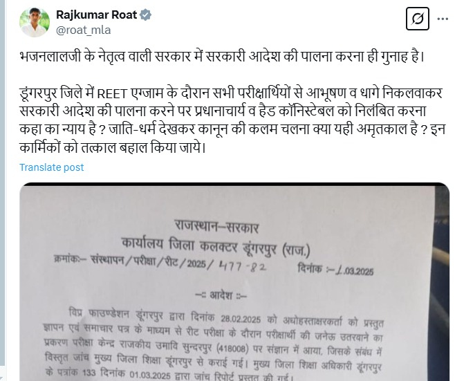 राजस्थान में रीट परीक्षा के दौरान जनेऊ उतरवाने के मामले ने तूल पकड़ लिया है। प्रदेश सरकार ने इस मामले में महिला सुपरवाइजर और पुलिस कॉन्स्टेबल को निलंबित कर दिया, जिसके विरोध में भारतीय आदिवासी पार्टी (BAP) के सांसद राजकुमार रोत ने सरकार पर निशाना साधते हुए इसे अन्याय बताया और निलंबित कर्मचारियों की तत्काल बहाली की मांग की है।