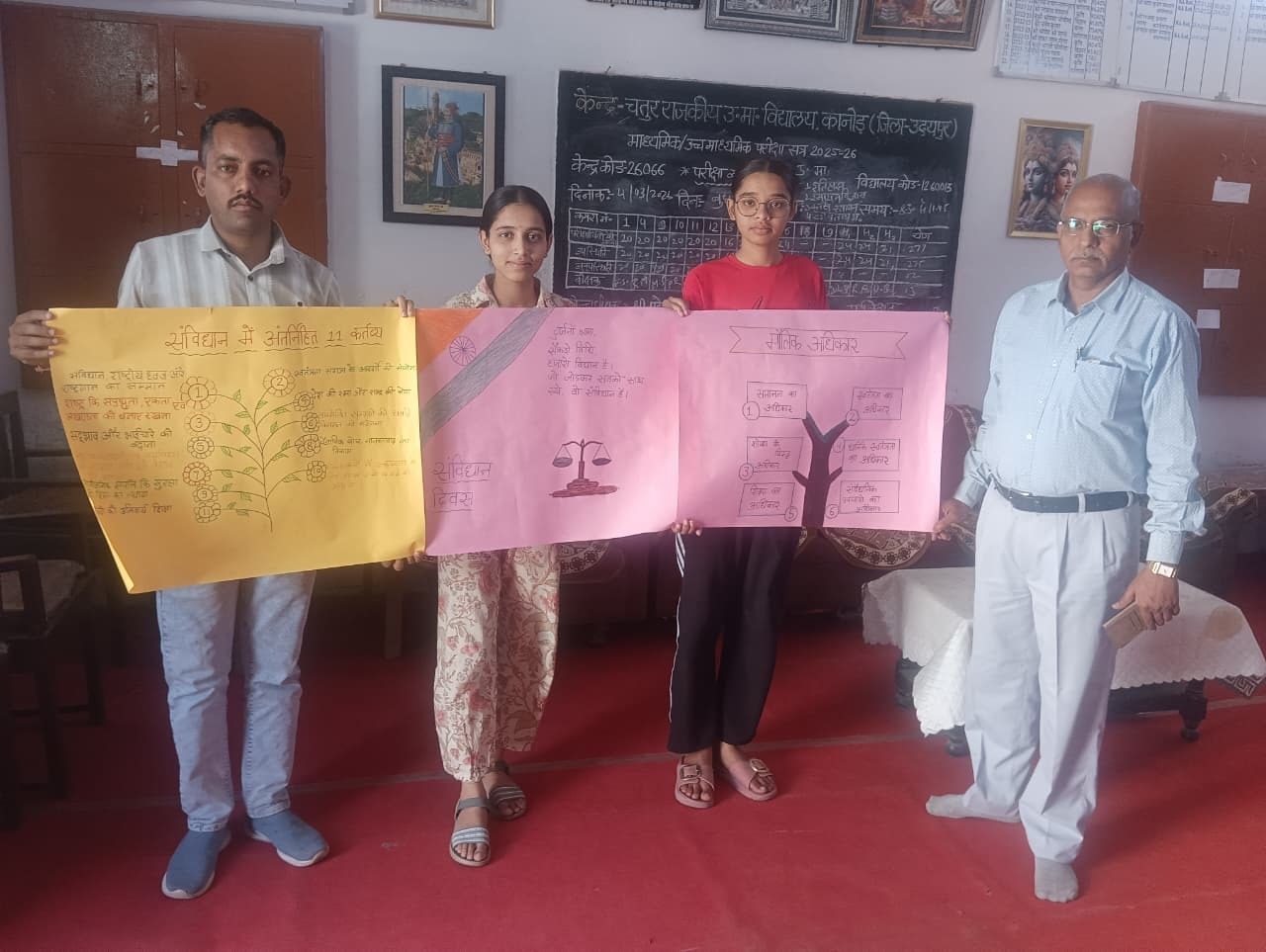 रिपोर्ट – राहुल पाटीदार 24 News Update Udaipur. कानोड़ के पीएम श्री चतुर राजकीय उच्च माध्यमिक विद्यालय में मेरा स्वाभिमान मेरा संविधान विषय पर पोस्टर प्रतियोगिता का आयोजन किया गया प्रतियोगिता प्रभारी निर्मल कुमार पुरोहित ने बताया कि इस प्रतियोगिता में लगभग 20 विद्यार्थियों ने संविधान के अलग-अलग विषय पर पोस्ट का निर्माण किया पुरोहित ने कहा कि आम नागरिकों के अधिकारों की रक्षा हेतु संविधान अधिकार प्रदान करता है पुरोहित ने बताया कि छात्रों ने मूल अधिकार मूल कर्तव्य संविधान संशोधन संवैधानिक पदाधिकारी पर पोस्टर बनाए व्याख्याता चंद्रशेखर स्वणकार ने कहा कि बच्चों को संविधान कक्ष का भ्रमण करना चाहिए तथा सदैव सीखना चाहिए भूपेंद्र जोशी ने संविधान निर्माताओं को याद करते हुए उनको श्रद्धा सुमन अर्पित कियेउप प्रधानाचार्य राजेंद्र प्रसाद व्यास ने कहा कि संविधान हमें कर्तव्यों के साथ-साथ मूल अधिकार भी प्रदान करता है किंतु हम लोग अधिकार को ज्यादा महत्वपूर्ण समझते हैं और कर्तव्य को भूल जाते हैं जबकि कर्तव्य का निरंतर पालन करते रहना चाहिए जिससे राष्ट्र मजबूत होता हैप्रधानाचार्य महेश कुमार मेघवाल ने कहा कि संविधानहमारे देश आत्मा है और अंतिम समय तक बचाए रखना हमारा परम कर्तव्य है पोस्टर प्रतियोगिता में प्रथम इशिका पालीवाल द्वितीय भावना तेली तृतीय अर्जुन सिंह राणावत रहे कार्यक्रम में अशोक शर्मा बसंती लाल व्यास परवीन मंसूरी मेघा मोदी सुरेश रामावत खेतू सिंह सुरभि लोहार फूल माला व्यास मनोज मीणा देवेश कुलमी चेतन सालवी गौरव सालवी देवी लाल मेघवाल समस्त विद्यालय परिवार ने उत्साह से भाग लिया Share this: Share on X (Opens in new window) X Share on Facebook (Opens in new window) Facebook More Email a link to a friend (Opens in new window) Email Share on WhatsApp (Opens in new window) WhatsApp Like this:Like Loading... Related Discover more from 24 News Update Subscribe to get the latest posts sent to your email. Type your email… Subscribe Post navigation माता-पिता ईश्वर का रूप, प्रतिदिन हमें उनका आशीष मिले : फत्तावत पन्नाधाय सुरक्षा सम्मान से सम्मानित हुआ राहडा फाउंडेशन, गोकाष्ठ अभियान की सराहना