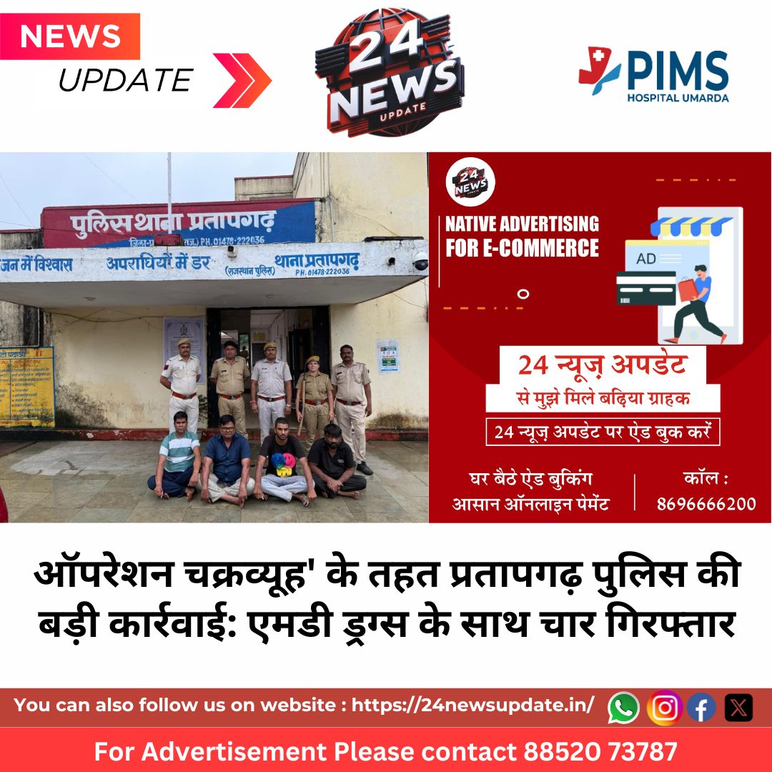 24 News Update जयपुर। जिला पुलिस अधीक्षक बी. आदित्य के निर्देशानुसार चलाए जा रहे ‘ऑपरेशन चक्रव्यूह’ अभियान के तहत प्रतापगढ़ पुलिस ने एक बड़ी सफलता हासिल की है। पुलिस ने एमडी ड्रग्स की डील करते हुए गुजरात, महाराष्ट्र और राजस्थान के चार व्यक्तियों को गिरफ्तार किया है। इन आरोपियों के पास से 10.39 ग्राम एमडी और 45,000 रुपये नकद जब्त किए गए हैं। जब्त की गई एमडी की अनुमानित कीमत 2 लाख 45 हजार रुपये बताई जा रही है। पुलिस ने इन तस्करों से एक आई-20 कार, एक मोटरसाइकिल और सात मोबाइल फोन भी जब्त किए हैं।