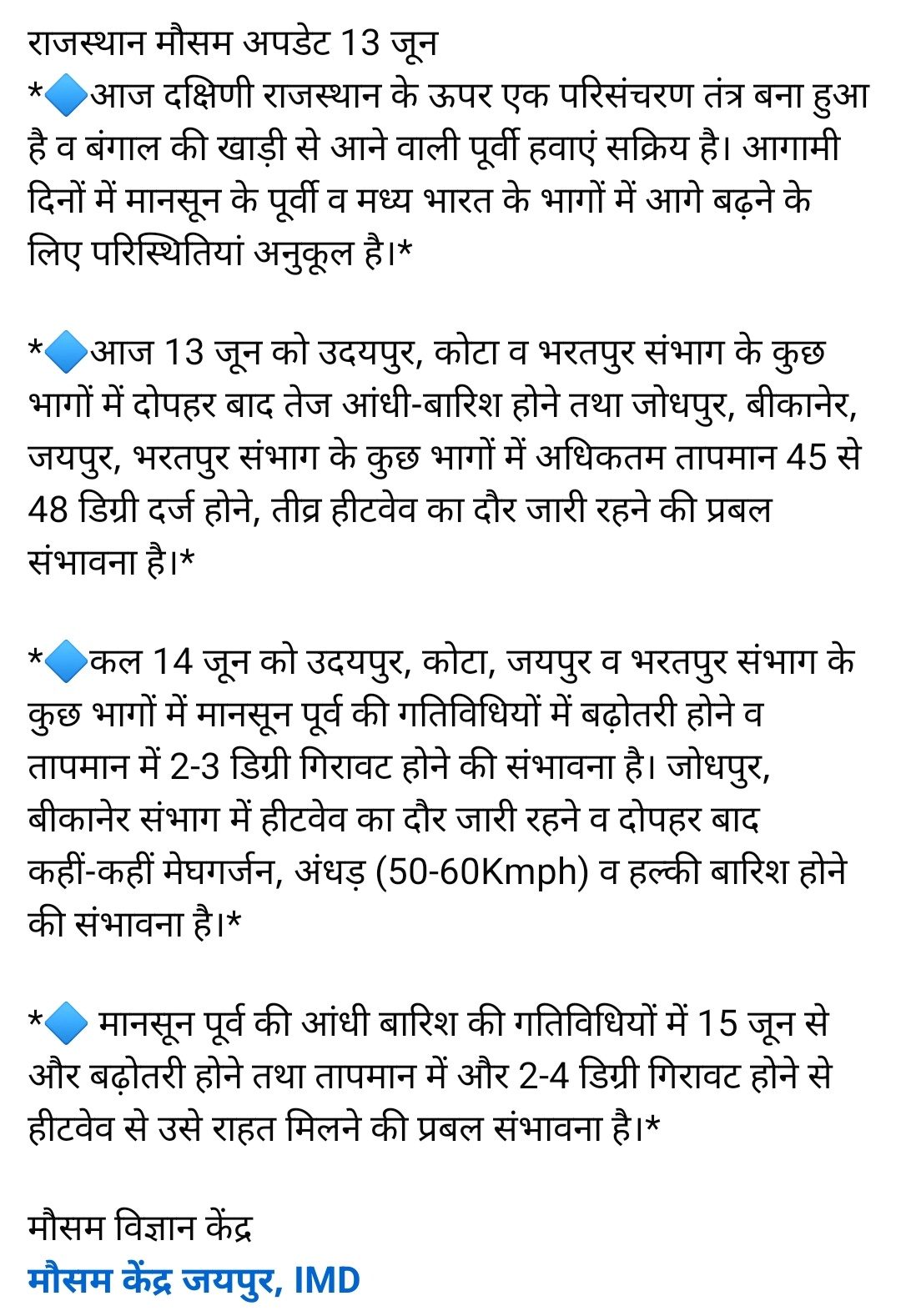 - 13-14 जून : पूर्वी व पश्चिमी राजस्थान के कई जिलों में लू, तेज आंधी व वज्रपात का खतरा।