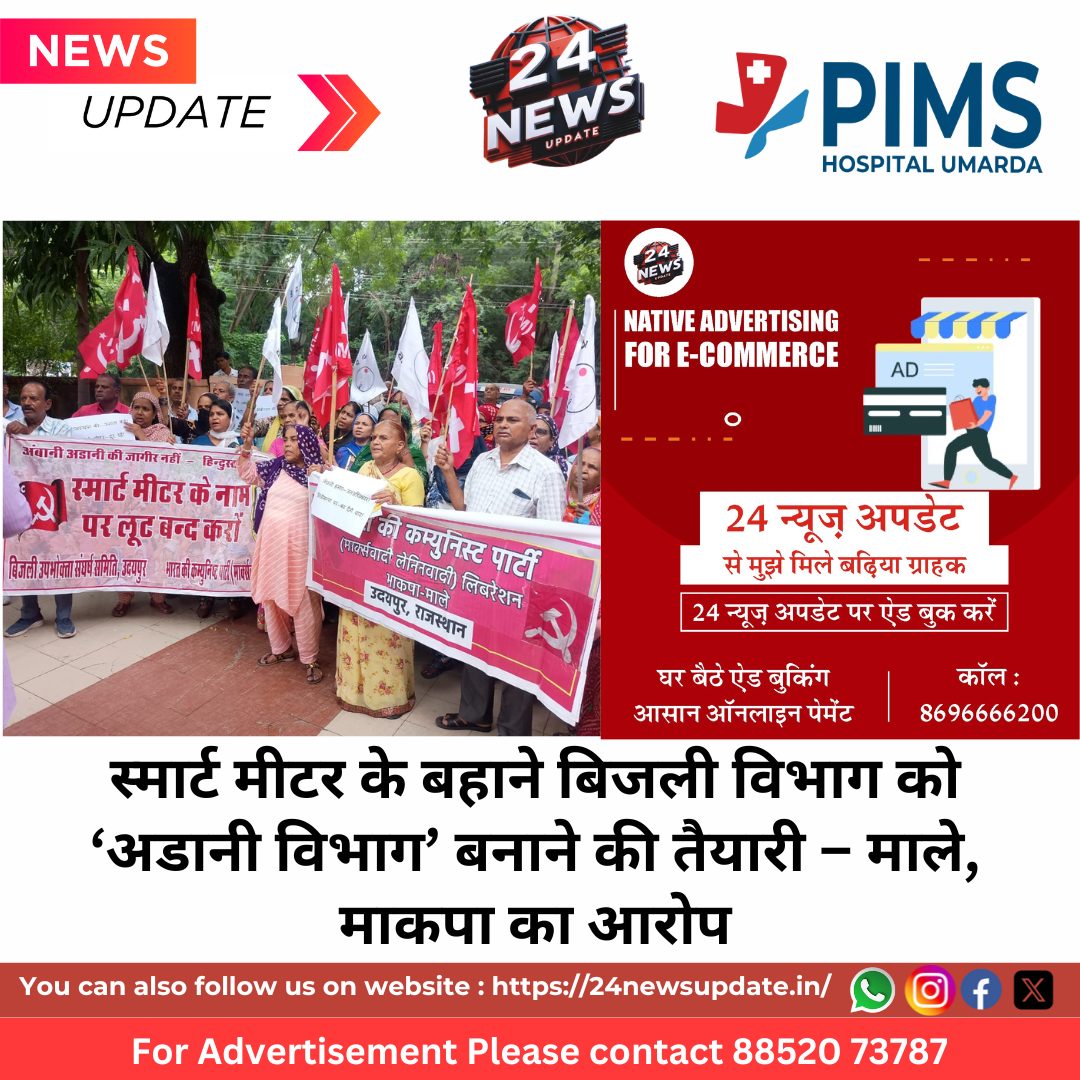 24 News Update उदयपुर। राजस्थान में बिजली उपभोग के स्मार्ट मीटर लगाने के बहाने बिजली विभाग को अडानी विभाग करने की तैयारी की जा रही है। यह विचार भाकपा (माले) के राज्य सचिव शंकर लाल चौधरी ने पटेल सर्कल, उदयपुर स्थित अजमेर विद्युत वितरण निगम लिमिटेड कार्यालय पर स्मार्ट मीटर लगाने एवं बिजली के निजीकरण के विरोध में प्रदर्शन के दौरान आयोजित सभा में व्यक्त किए।