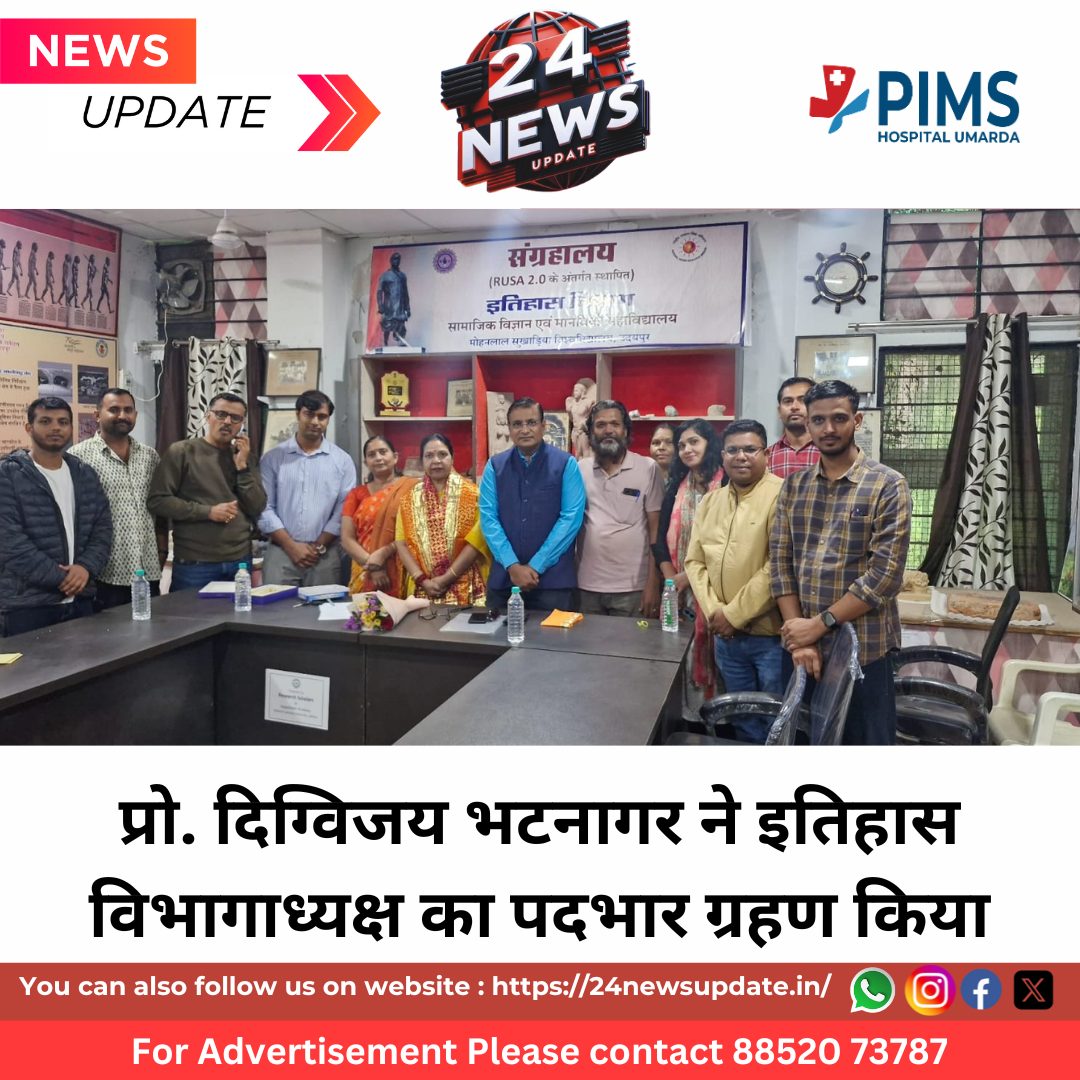 24 News Udpate उदयपुर। मोहनलाल सुखाड़िया विश्वविद्यालय, उदयपुर के सामाजिक विज्ञान एवं मानविकी महाविद्यालय अंतर्गत इतिहास विभाग में आज गुरुवार को प्रोफेसर दिग्विजय भटनागर ने विभागाध्यक्ष पद का कार्यभार ग्रहण किया। इस अवसर पर आयोजित स्वागत कार्यक्रम में डॉ. प्रतिभा (प्रोफेसर एवं पूर्व विभागाध्यक्ष, इतिहास विभाग), डॉ. पीयूष भादविया (सहायक आचार्य, इतिहास विभाग), डॉ. मनीष श्रीमाली (सहायक आचार्य, इतिहास विभाग), डॉ. बालूदान बारहठ (सहायक आचार्य, राजनीति विज्ञान विभाग), श्री नारायण लाल सालवी (अध्यक्ष, मोहनलाल सुखाड़िया विश्वविद्यालय कर्मचारी संगठन), डॉ. महेंद्र सिंह चारण, श्री मोहित सिसोदिया, पायल माली तथा तारा बैरवा सहित इतिहास विभाग के स्कॉलर, छात्र और कर्मचारी उपस्थित रहे।