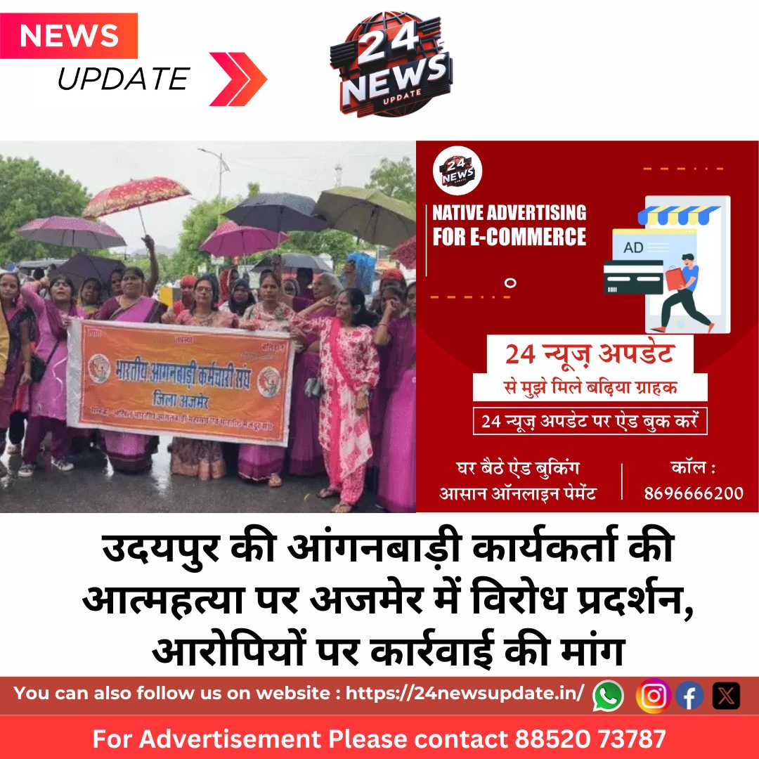 24 News Update उदयपुर/अजमेर। उदयपुर जिले की एक आंगनबाड़ी कार्यकर्ता अंजूबाला द्वारा प्रताड़ना से तंग आकर आत्महत्या करने के मामले में प्रदेशभर में आक्रोश फैलता जा रहा है। इसी कड़ी में अजमेर में भारतीय आंगनबाड़ी कर्मचारी संघ से जुड़ी महिला कार्यकर्ताओं ने बारिश के बीच कलेक्ट्रेट पर जोरदार प्रदर्शन किया और मुख्यमंत्री के नाम जिला कलेक्टर को ज्ञापन सौंपा।