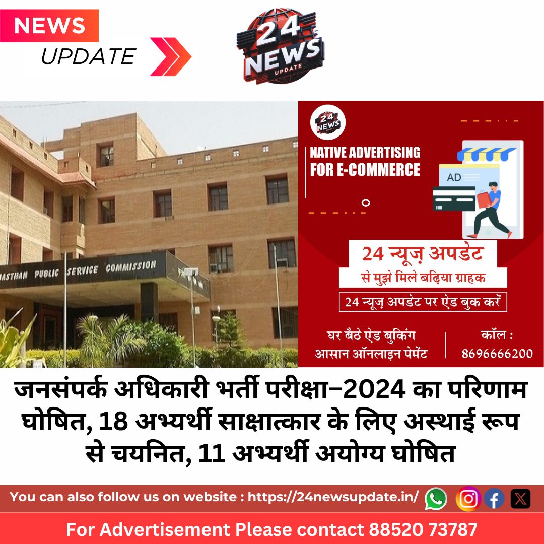 24 न्यूज अपडेट, अजमेर। राजस्थान लोक सेवा आयोग (RPSC) ने सूचना एवं जनसंपर्क विभाग में जनसंपर्क अधिकारी (Public Relations Officer) भर्ती परीक्षा–2024 का परिणाम घोषित कर दिया है। आयोग ने इस परीक्षा में 18 अभ्यर्थियों को साक्षात्कार के लिए पूर्णतः अस्थाई रूप से चयनित किया है। वहीं, उत्तर पुस्तिका में 10 प्रतिशत से अधिक प्रश्नों के उत्तर न भरने के कारण 11 अभ्यर्थियों को अयोग्य घोषित किया गया है।