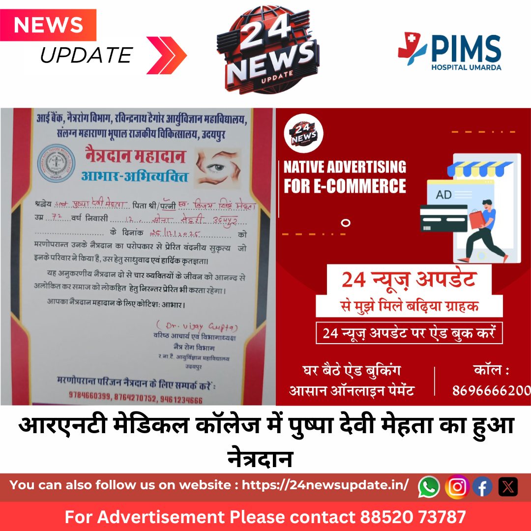 24 News Update उदयपुर, 26 दिसम्बर। शहर के प्रतिष्ठित परिवार की पुष्पा देवी मेहता के निधन के उपरांत, उनके परिवार ने उनके नेत्रों का दान करने का निर्णय लिया। यह दान आई बैंक, नेत्ररोग विभाग, रवींद्रनाथ आयुर्विज्ञान महाविद्यालय द्वारा किया गया है। लायन अशोक जैन एवं लायंस क्लब उदयपुर प्रताप की प्रेरणा से दिवंगत आत्मा के नेत्रों का उत्सरण किया गया है।यह नेत्र दान दो से चार व्यक्तियों के जीवन को आनंद से आलोकित करेगा और समाज को लोकहित हेतु निरंतर प्रेरित करता रहेगा। लायंस क्लब उदयपुर प्रताप की ओर से दिवंगत आत्मा के परिवार को इस नेत्रदान हेतु आभार व्यक्त करते हैं।