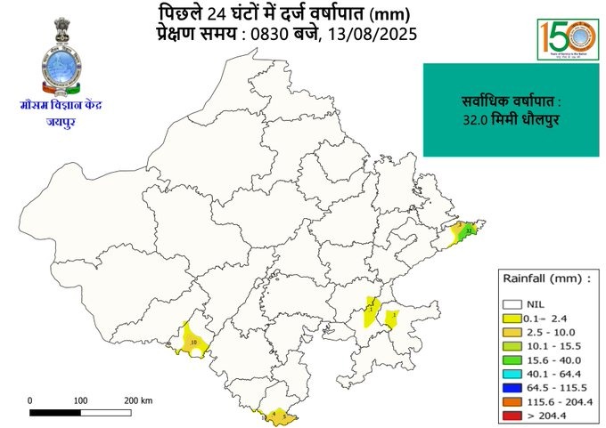पिछले 24 घंटे के दौरान उदयपुर सहित राजस्थान के अधिकांश हिस्सों में मौसम शुष्क रहा। हालांकि, पूर्वी राजस्थान में कुछ स्थानों पर हल्की से मध्यम वर्षा दर्ज की गई, जबकि पश्चिमी राजस्थान में मौसम शुष्क बना रहा। राज्य में सर्वाधिक वर्षा धौलपुर में 32.0 मिमी दर्ज की गई।