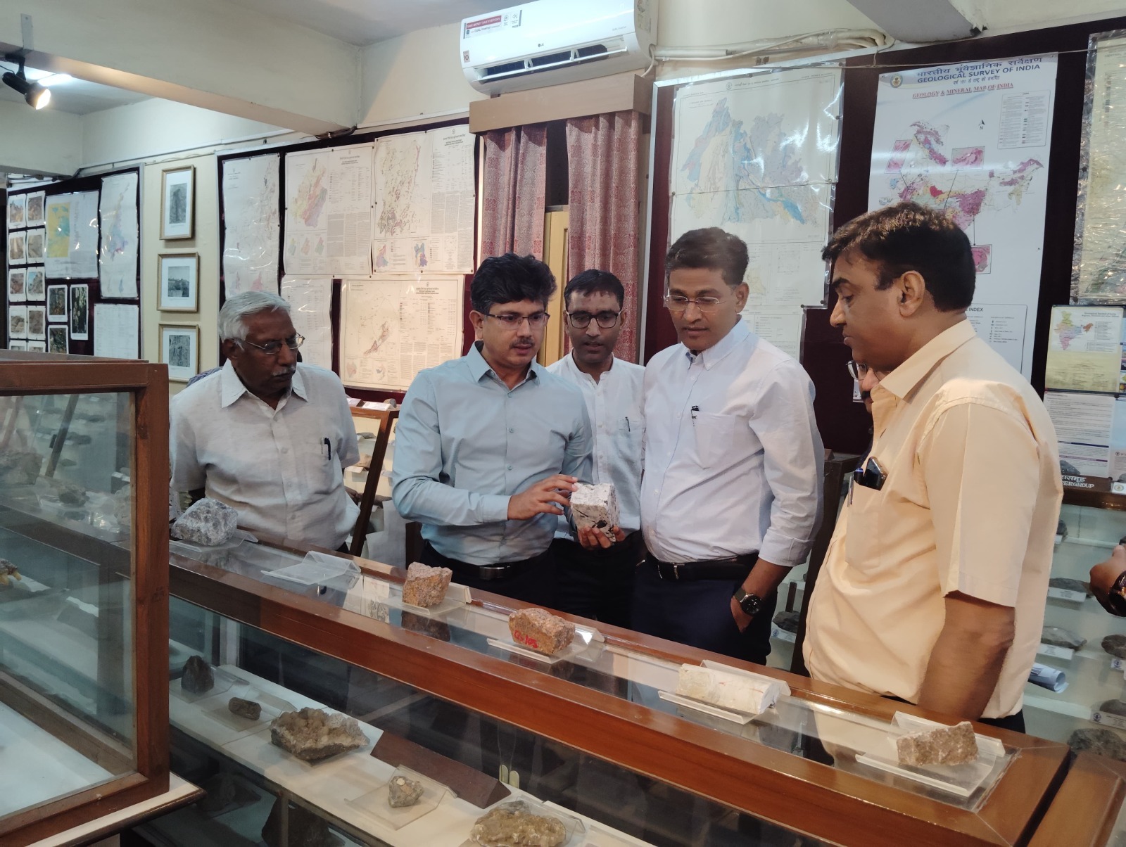इस अवसर पर श्री रविकान्त ने झालाना स्थित जियोलॉजिकल सर्वे ऑफ इंडिया (GSI) के खनिज संग्रहालय का निरीक्षण किया। उनके साथ GSI के उपमहाप्रबंधक श्री अनिंद्य भट्टाचार्य, निदेशक श्री हरीश मिस्त्री, ADG श्री आलोक जैन और SG श्री सुशील हुड्डा भी उपस्थित थे। संग्रहालय में संरक्षित जीवाश्म, चट्टानें, खनिज नमूने और भूवैज्ञानिक मानचित्रों का अवलोकन करते हुए उन्होंने GSI के संरक्षण और डॉक्यूमेंटेशन कार्यों की सराहना की। GSI के निदेशक (भूविज्ञान) श्री एम.वाई. खांडे और भूविज्ञानी त्रिपर्णा घोष ने उन्हें बीजीसी चट्टानों, आर्कियन से लेकर टर्शियरी युग तक की चट्टानों, और उनकी विकास यात्रा की जानकारी दी। उन्होंने बताया कि राजस्थान में अरावली श्रृंखला, दिल्ली सुपरग्रुप, विंध्यन वेल्ट और मारवाड़ युग की खनिज चट्टानों के समृद्ध स्रोत उपलब्ध हैं। सरकार खनिज अन्वेषण (Mineral Exploration) कार्य को तेजी से आगे बढ़ा रही है और खनन ब्लॉकों की योजनाबद्ध नीलामी की जा रही है, जिससे राज्य की खनिज संपदा का संतुलित और सतत विकास सुनिश्चित किया जा सके।