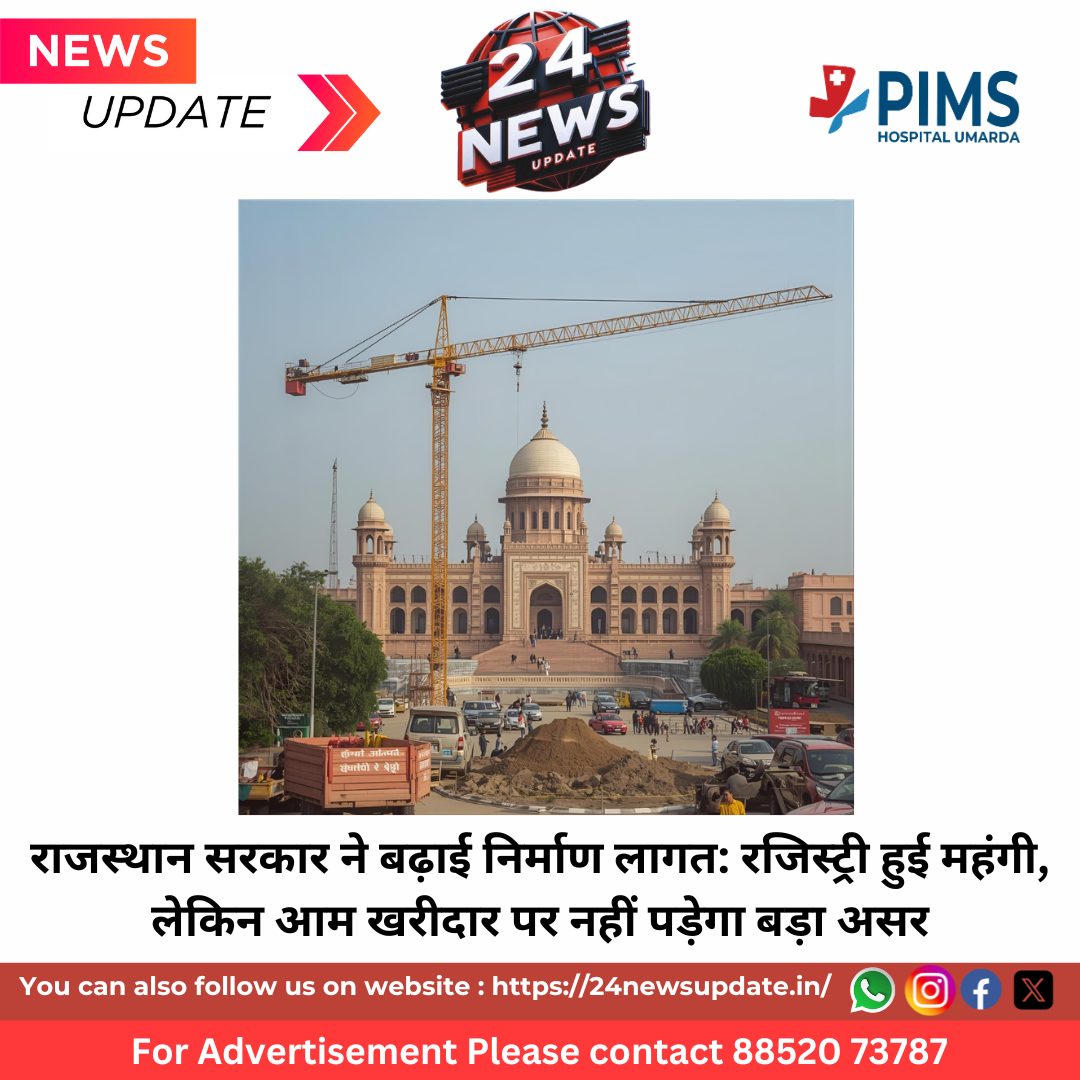 24 News Update जयपुर | राज्य सरकार ने इस वर्ष संपत्ति रजिस्ट्री से जुड़े नियमों में महत्वपूर्ण संशोधन किया है। स्टांप ड्यूटी, रजिस्ट्रेशन शुल्क और जमीन की DLC दरों को जस का तस रखते हुए सरकार ने कंस्ट्रक्शन कॉस्ट (निर्माण लागत) में भारी बढ़ोतरी की है। नई दरें लागू होने के बाद कई श्रेणियों की रजिस्ट्री का न्यूनतम मूल्य बढ़ जाएगा।