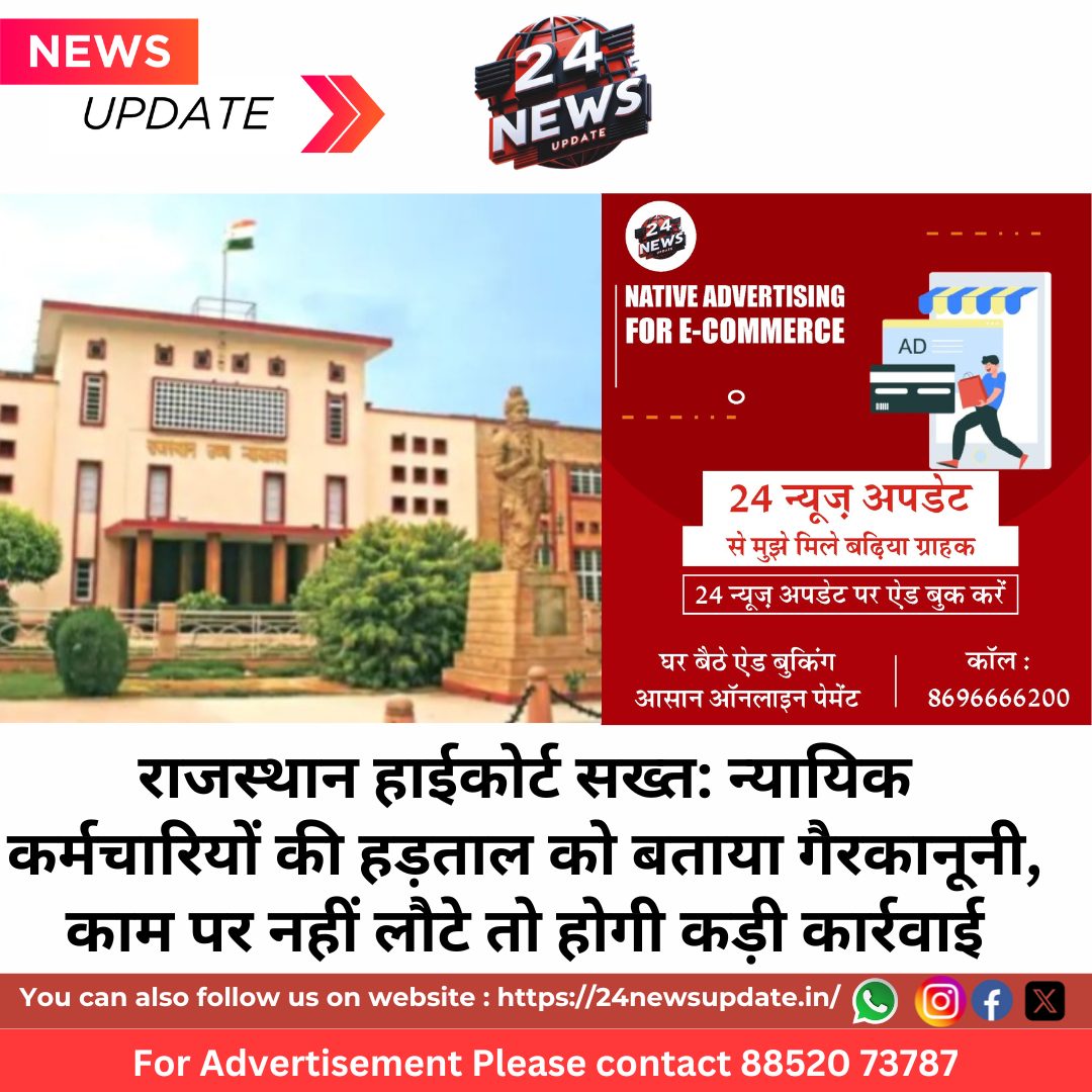24 न्यूज अपडेट, स्टेट डेस्क। राजस्थान की अधीनस्थ अदालतों में जारी न्यायिक कर्मचारियों की हड़ताल पर राजस्थान हाईकोर्ट ने सख्त रुख अपनाते हुए इसे पूरी तरह अवैध करार दिया है। अदालत ने स्पष्ट निर्देश दिए हैं कि सभी कर्मचारी शुक्रवार सुबह 10 बजे तक अपने कार्यस्थलों पर लौटें, अन्यथा नियमानुसार कठोर कार्रवाई की जाएगी। कोर्ट ने यह भी कहा कि किसी भी परिस्थिति में न्यायिक व्यवस्था को बाधित करने वाली हड़ताल बर्दाश्त नहीं की जाएगी।