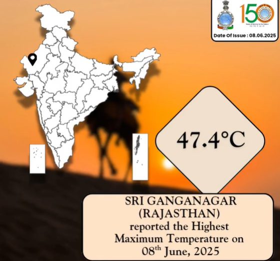08-11 के दौरान पश्चिमी राजस्थान के कई/कुछ स्थानों पर उष्ण लहर चलने की संभावना है, जबकि 09 जून को कुछ अलग-अलग हिस्सों में भीषण उष्ण लहर चलने की संभावना है।