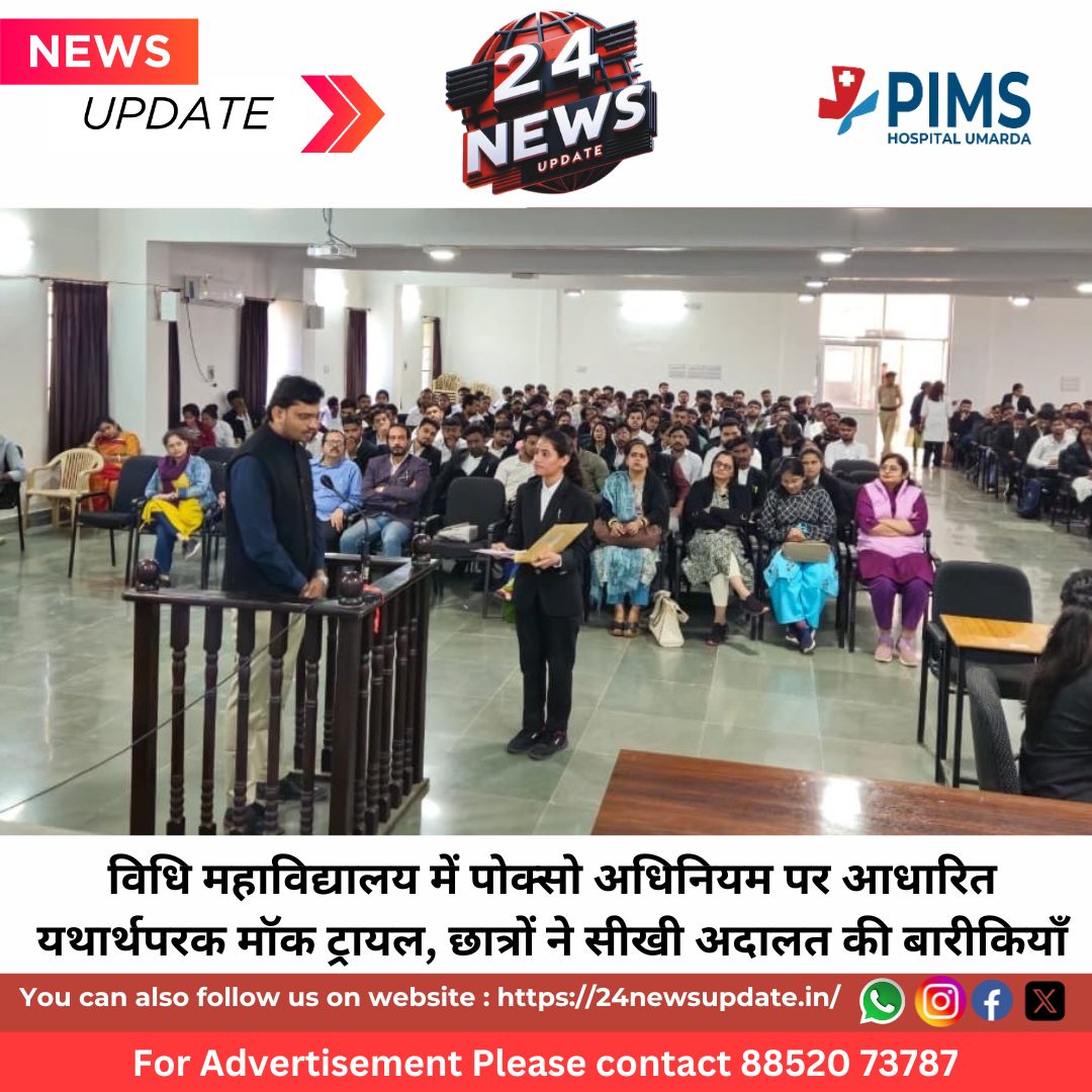 24 News Update उदयपुर। विश्वविद्यालय विधि महाविद्यालय में पोक्सो (बालकों का लैंगिक अपराध से संरक्षण अधिनियम, 2012) पर आधारित एक अत्यंत शिक्षाप्रद और वास्तविक न्यायालयीन वातावरण प्रदान करने वाला मॉक ट्रायल आयोजित किया गया। इस आयोजन का मुख्य उद्देश्य विद्यार्थियों को वास्तविक अदालत की कार्यप्रणाली—जैसे FIR वाचन, साक्ष्य प्रस्तुति, जिरह, बहस और निर्णय लेखन—का व्यावहारिक अनुभव कराना था।