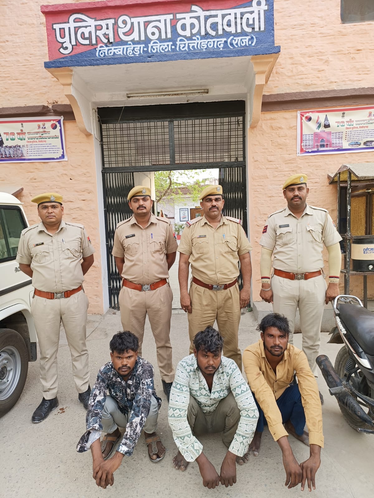 घटना का शीध्र खुलासा कर आरोपियों पता लगा कर गिरफ्तार करने के क्रम में डीएसपी निम्बाहेड़ा बद्रीलाल राव के निर्देशन में थानाधिकारी कोतवाली निम्बाहेडा रामसुमेर मीणा पु.नि. के निर्देश पर एएसआई सूरज कुमार के नेतृत्व में हैड कानिस्टेबल हरविन्द्र सिंह व कानिस्टेबल राकेश, विरेन्द्र, सुमित कुमार, विजय सिंह, रामकेश द्वारा आसूचना संकलन कर आरोपियों एमपी के नीमच जिले के चोकन्ना बालाजी के पास नीमच, थाना नीमच केन्ट निवासी 23 वर्षीय अजय पुत्र ज्ञानसिह पारदी व 20 वर्षीय राजु उर्फ शिवा पुत्र बिरजु उर्फ गोपाल पारदी एवं रेल्वे स्टेशन के पास भोपाल, जिला भोपाल निवासी 22 वर्षीय गणेश पुत्र लालचन्द पारदी को डिटेन कर मामले में वारदात के सम्बन्ध में गहनता से पुछताछ की गई तो आरोपीगणों द्वारा वारदात करना स्वीकार किया ।