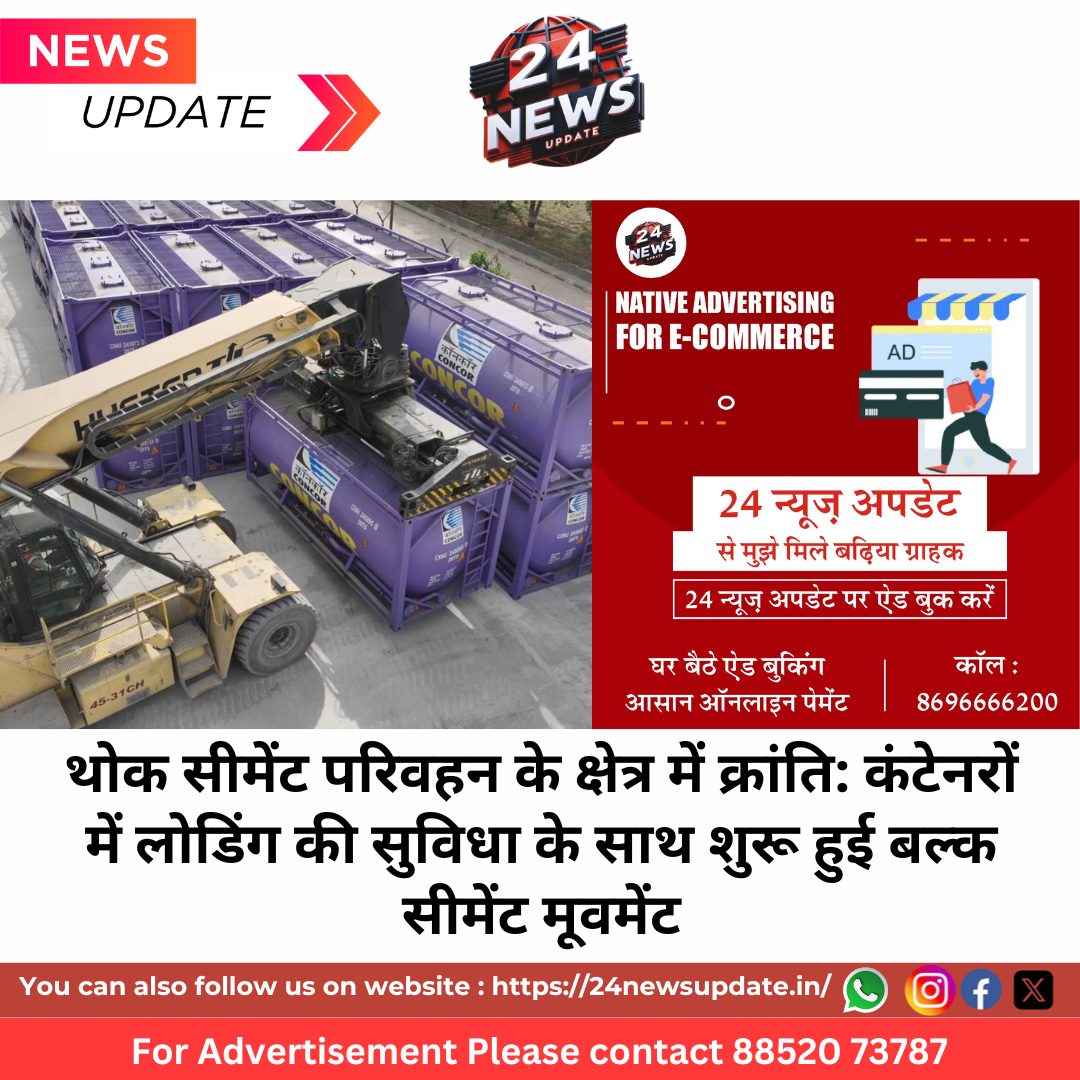 24 News Updateनई दिल्ली/मेलचेरुवु/बैंगलोर। भारत में थोक सीमेंट परिवहन अब एक नए युग में प्रवेश कर चुका है। कॉनकॉर (कंटेनर कॉरपोरेशन ऑफ इंडिया) ने पहली बार विशेष टैंक कंटेनरों के माध्यम से लूज (खुली) सीमेंट मूवमेंट की सुविधा शुरू करके सीमेंट लॉजिस्टिक्स की तस्वीर बदल दी है। यह पहल पारंपरिक बैग परिवहन प्रणाली पर निर्भरता को कम करने और लॉजिस्टिक्स को अधिक टिकाऊ, सुरक्षित और कुशल बनाने की दिशा में एक ऐतिहासिक कदम मानी जा रही है।