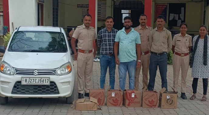 24 News Update उदयपुर। जिला पुलिस अधीक्षक योगेश गोयल के निर्देश पर चल रहे अवैध शराब विरोधी अभियान के तहत ऋषभदेव थाना पुलिस ने एक बड़ी कार्रवाई को अंजाम दिया। पुलिस ने नेशनल हाइवे-48 पर नाकाबंदी के दौरान एक कार से अंग्रेजी और देशी शराब के कार्टून जब्त कर आरोपी को गिरफ्तार किया। अतिरिक्त पुलिस अधीक्षक अंजना सुखवाल और वृताधिकारी राजीव राडर के सुपरविजन में थानाधिकारी भरत सिंह राजपुरोहित के नेतृत्व में गठित टीम ने शुक्रवार को नाकाबंदी के दौरान कार्रवाई की। पुलिस ने एक अल्टो कार से 4 कार्टून अंग्रेजी शराब और 1 कार्टून देशी शराब बरामद की। गिरफ्तार आरोपी की पहचान विनोद कुमार पुत्र गणेशलाल निवासी निचला मांडवा, थाना ऋषभदेव, जिला उदयपुर के रूप में हुई है। आरोपी के खिलाफ प्रकरण संख्या 213/2025 धारा 19/54 राजस्थान आबकारी अधिनियम 1950 में मुकदमा दर्ज कर आगे की जांच शुरू कर दी गई है।